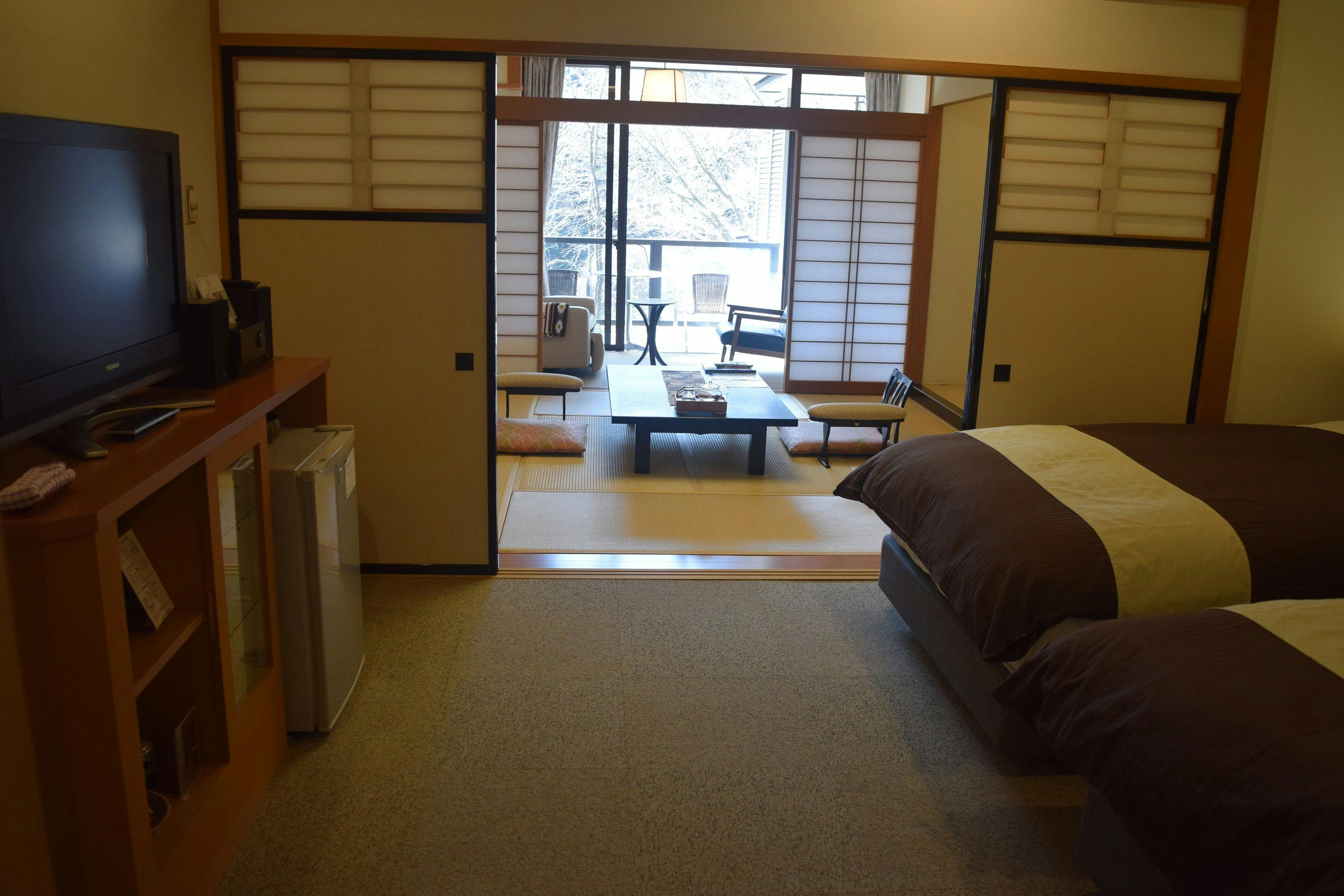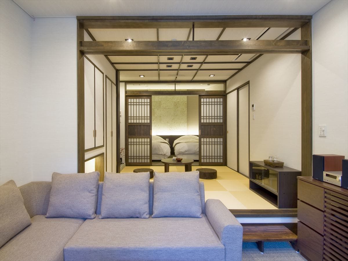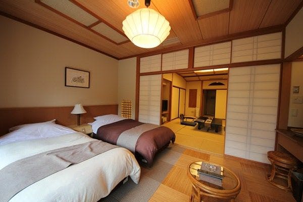 お部屋はモダン和室「ふじ」(40平米)になります。柱のない広々としたフローリングの和洋室。ツインのベッドと6畳の高座敷タイプの和室はシックな作りなお部屋です。モダン造りのお部屋は若い方から高齢の方まで十二分にお寛ぎいただけます。