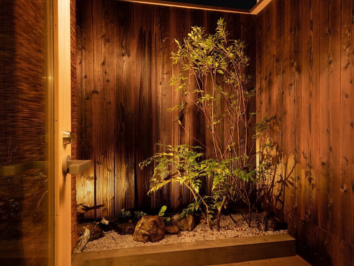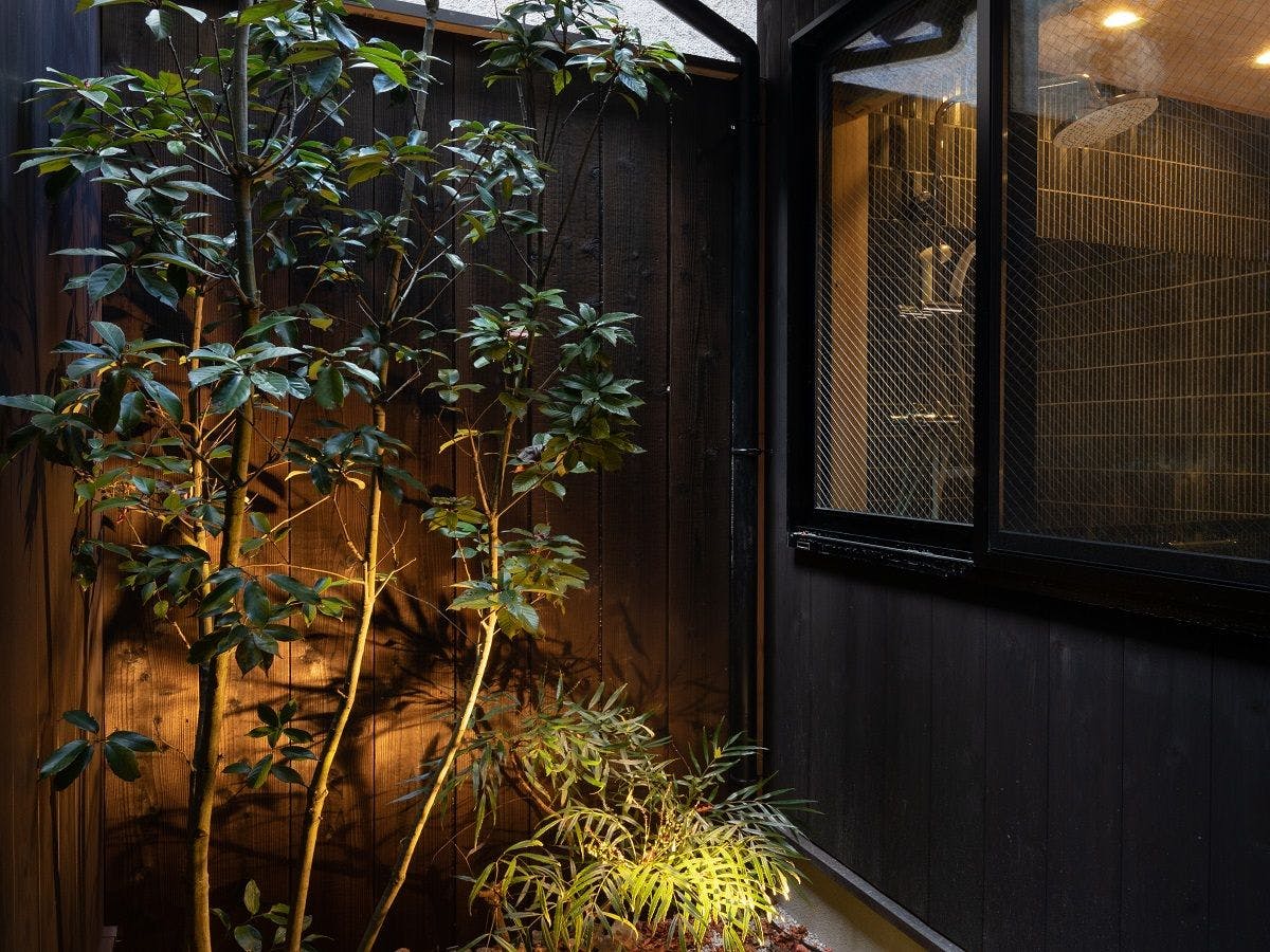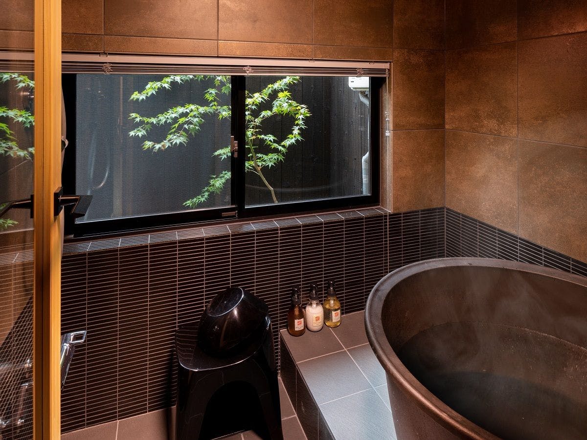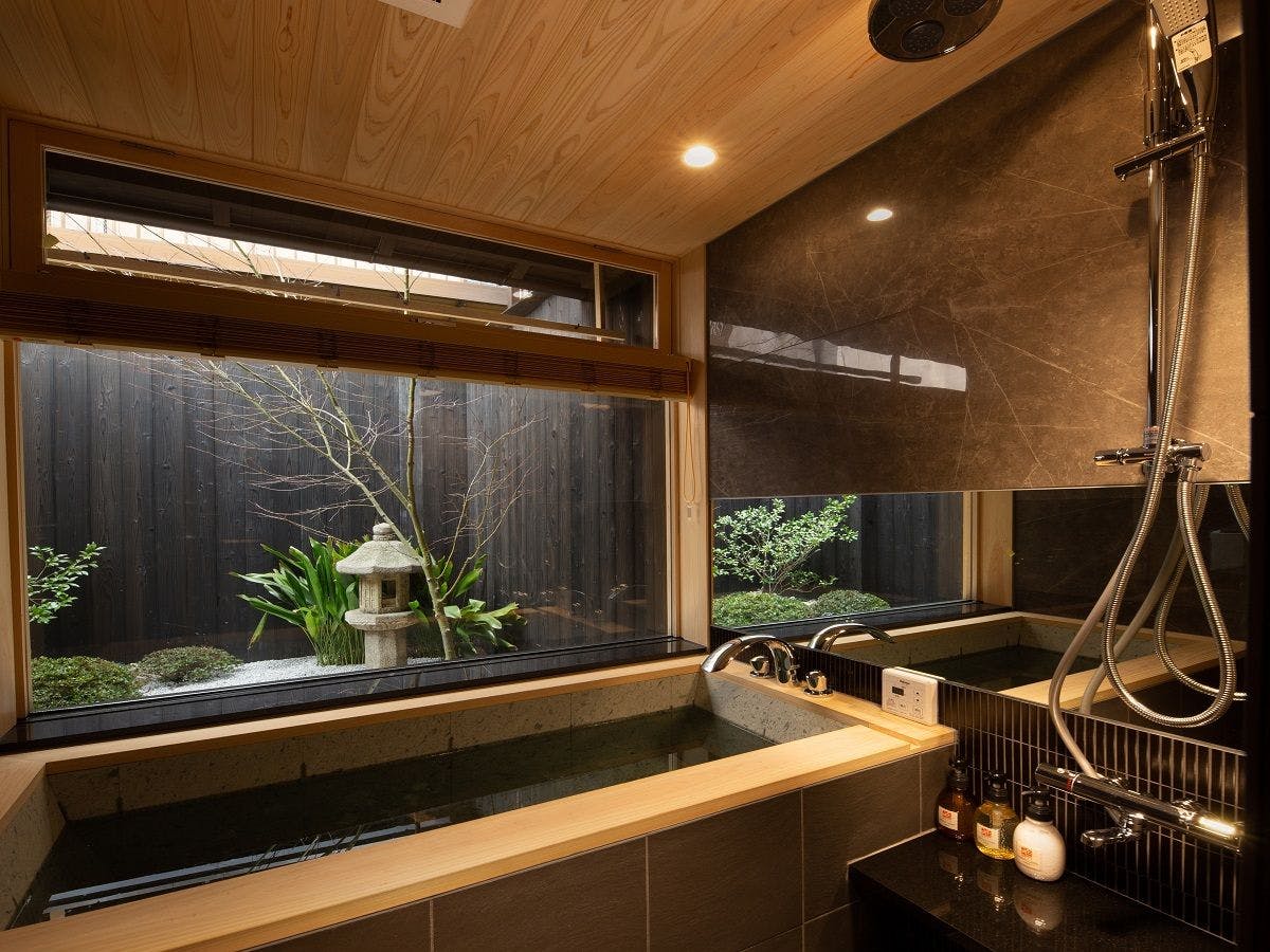 観光の出発点「京都」駅や世界遺産「東寺」にもほど近く非常に便利な立地。坪庭を眺めながら湯汲が可能な浴室や木のぬくもりを感じられる室内はは非日常な空間を演出している。