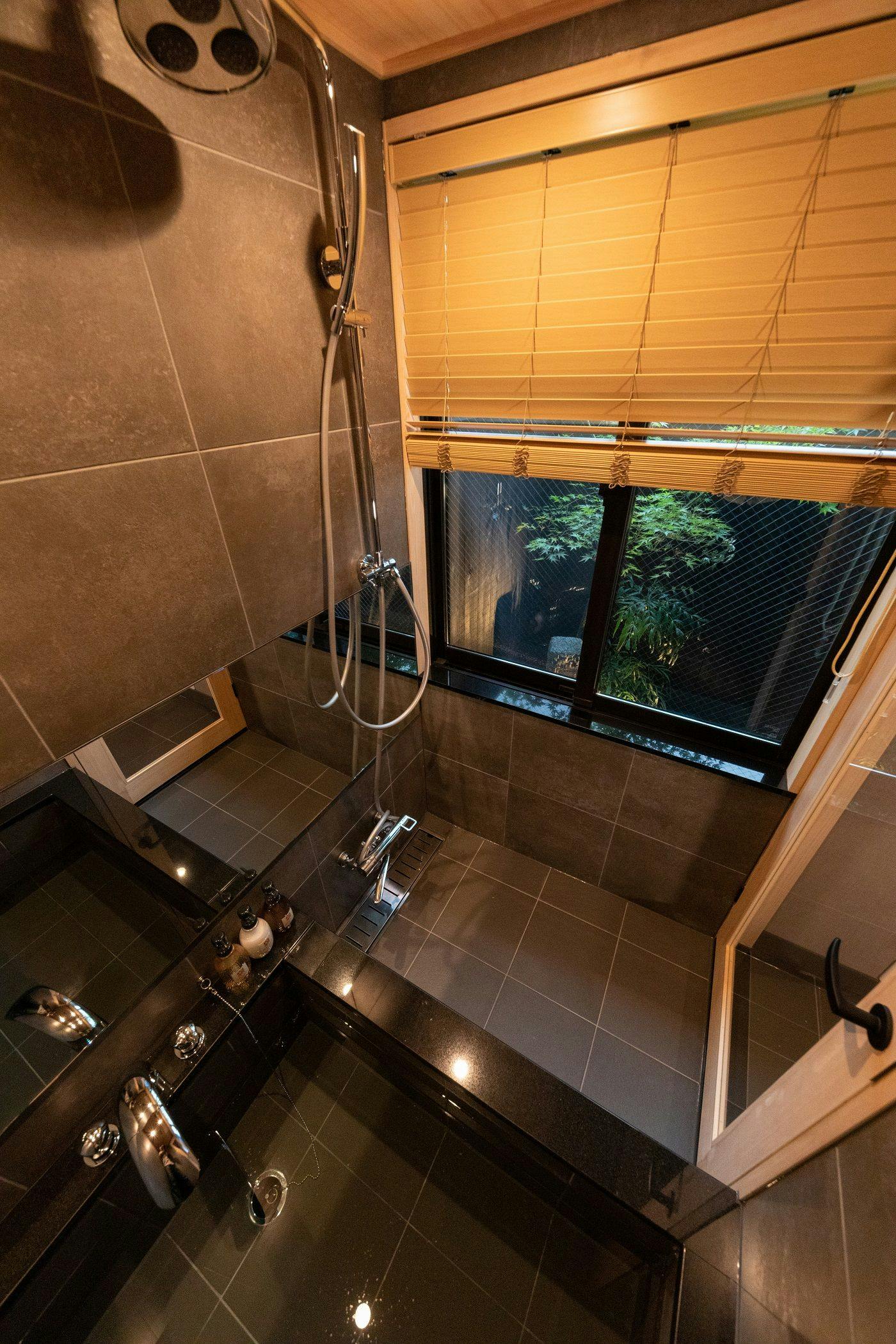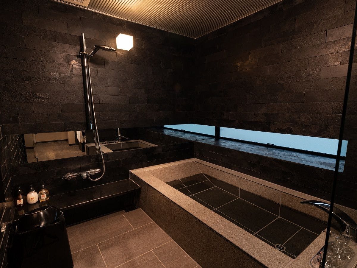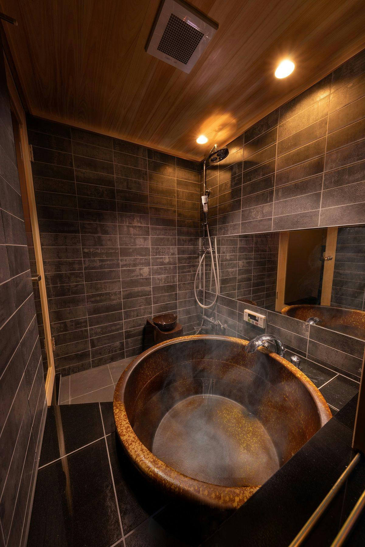 観光の出発点「京都」駅や世界遺産「東寺」にもほど近く非常に便利な立地。坪庭を眺めながら湯汲が可能な浴室や木のぬくもりを感じられる室内はは非日常な空間を演出している。