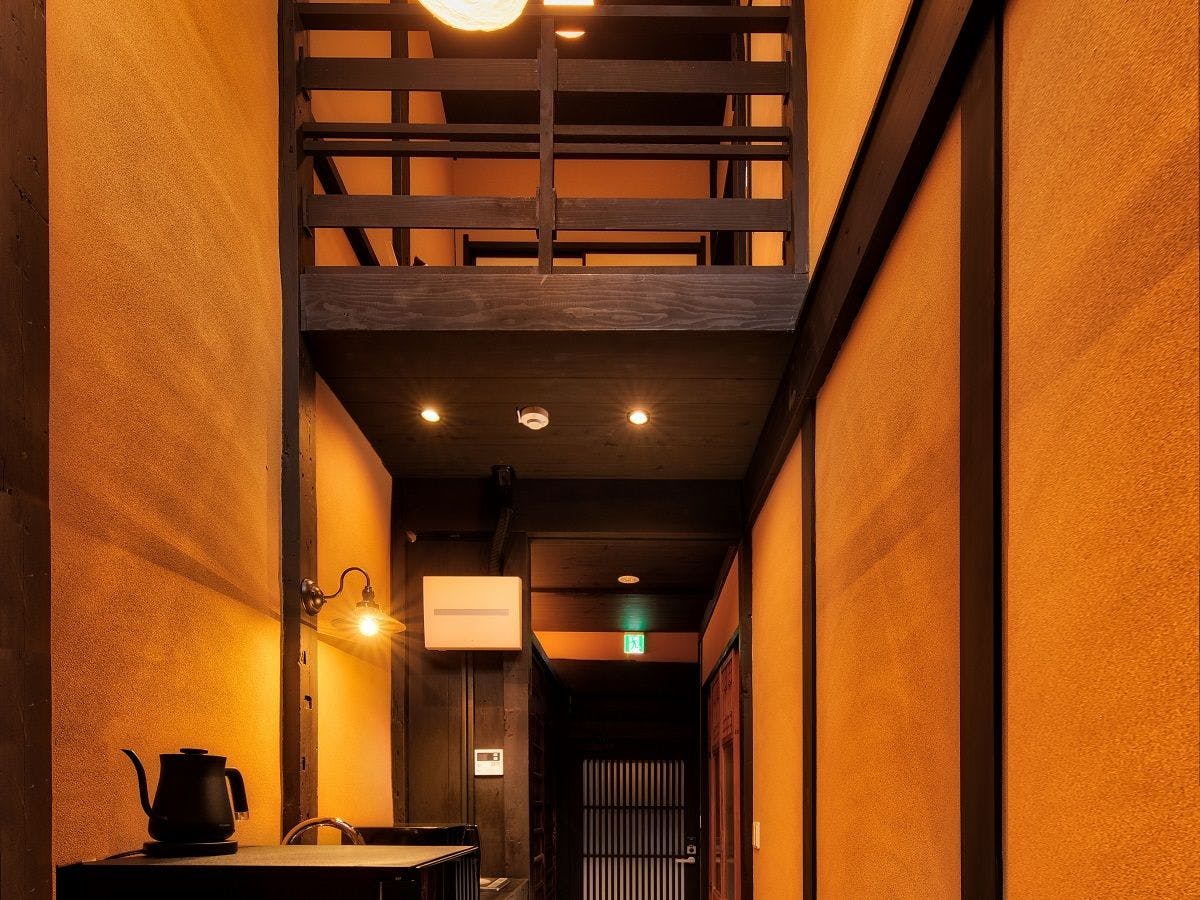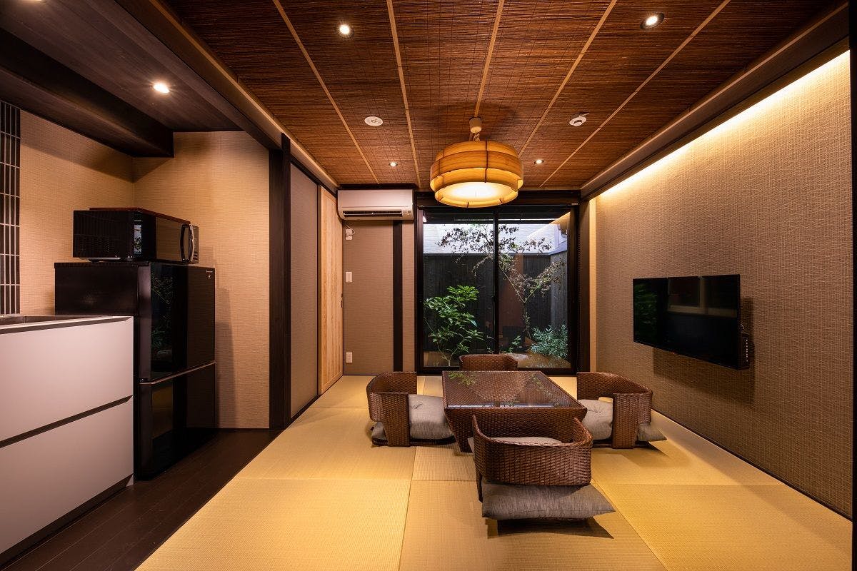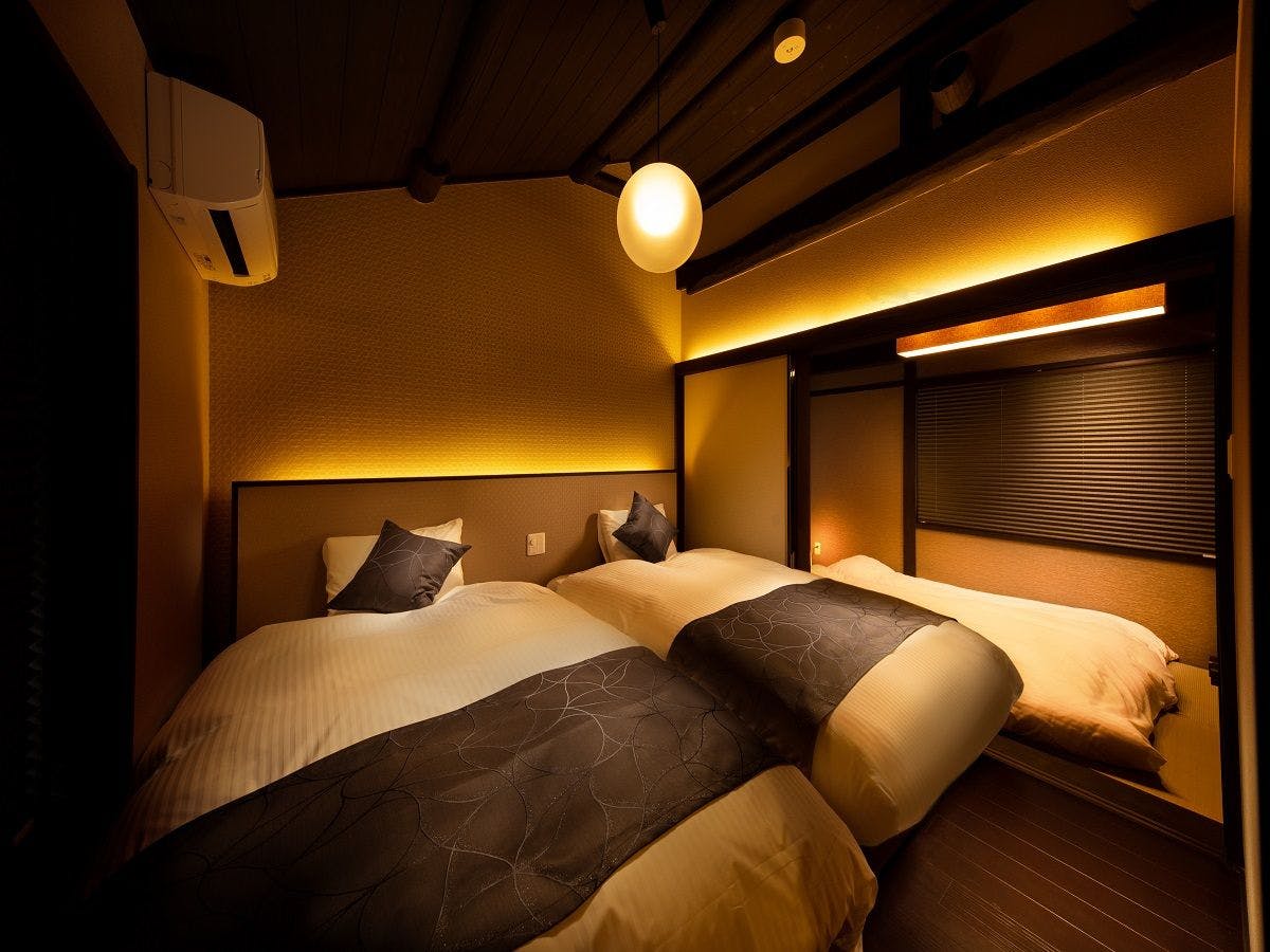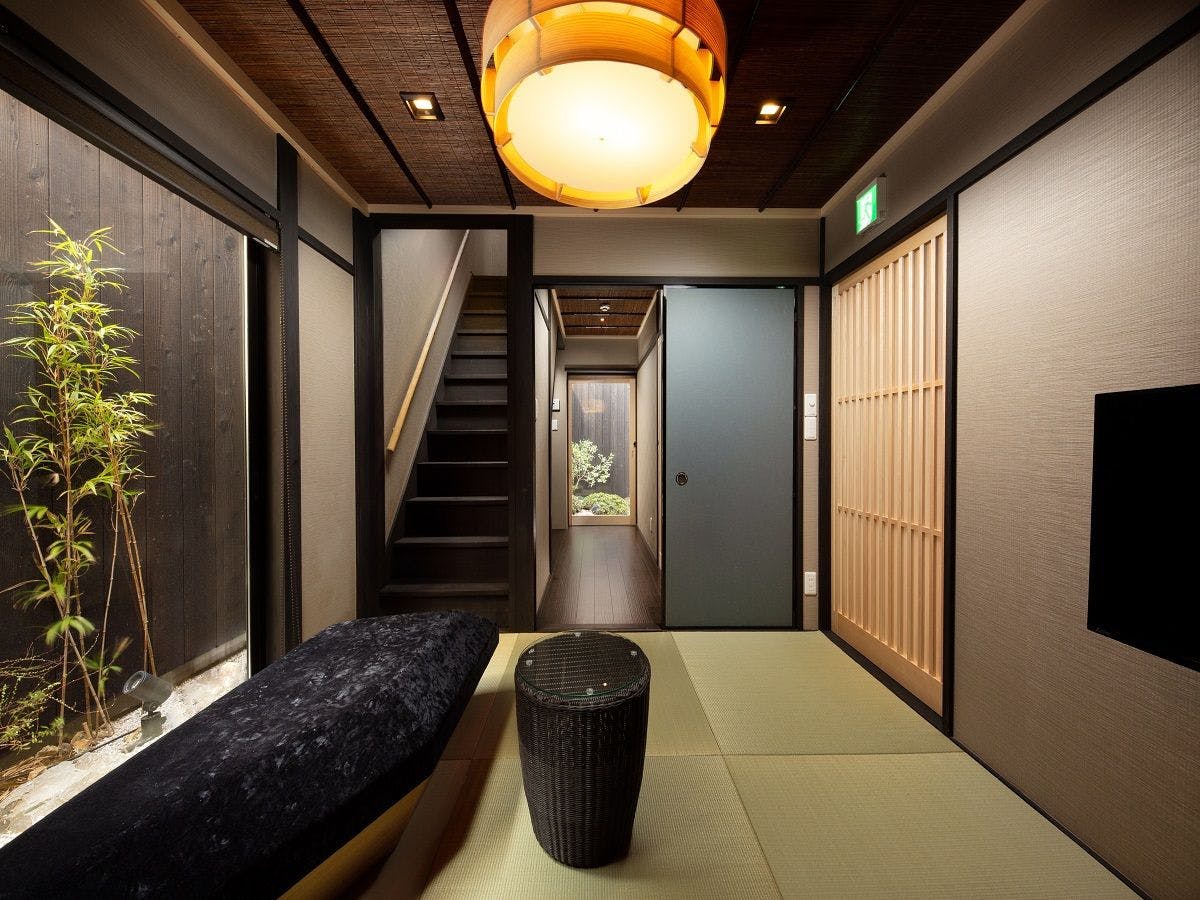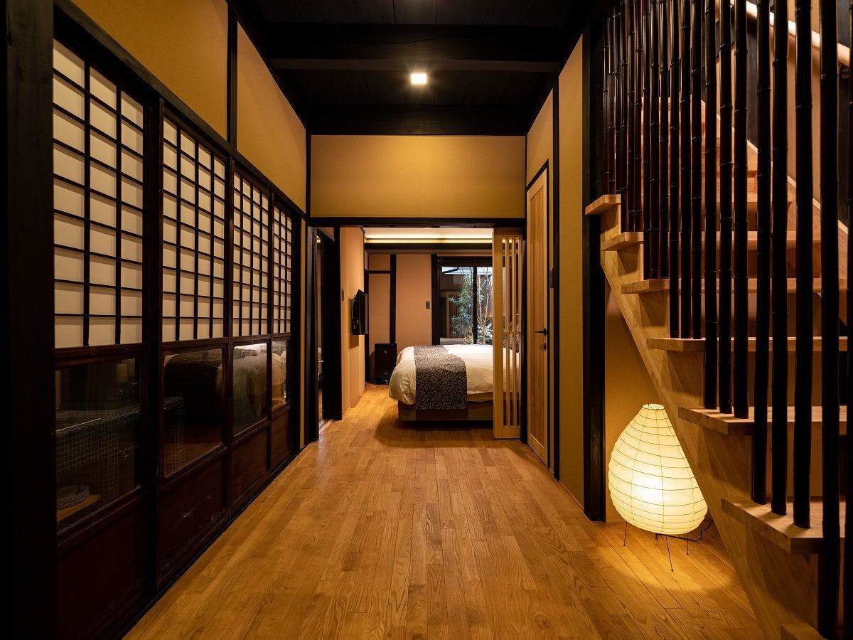 静かな住宅街の片隅に佇む京町家は京都の玄関口「京都」駅から徒歩約5分。木のぬくもりを感じる奥庭を望む寝室は、暖かみのある間接照明を使った高級感ある造り。充実の設備を備えており快適な滞在を実現。