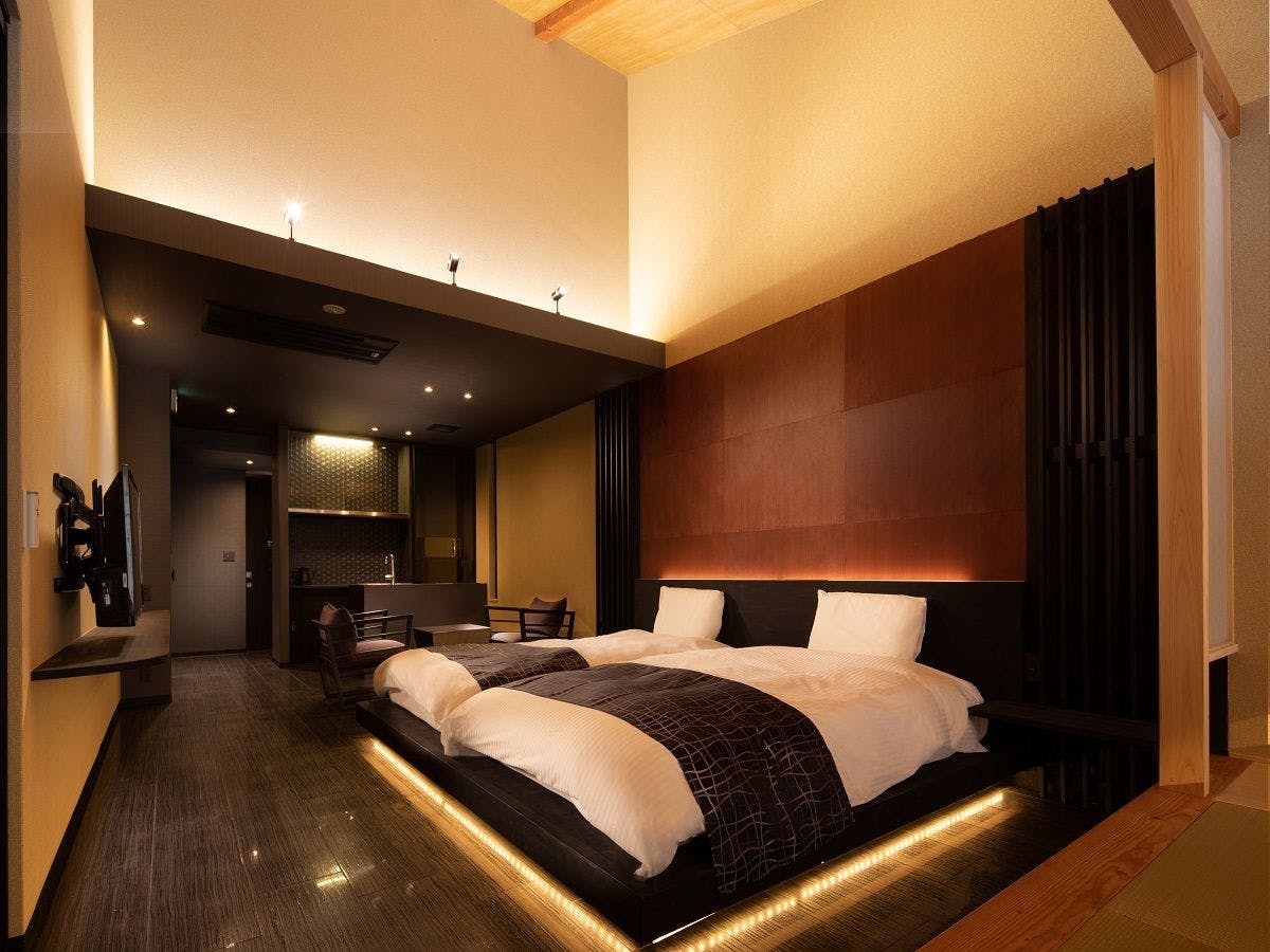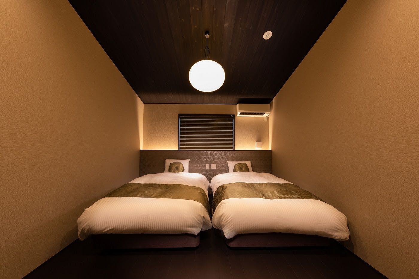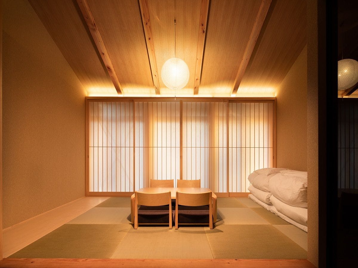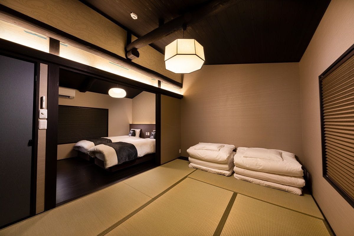 静かな住宅街の片隅に佇む京町家は京都の玄関口「京都」駅から徒歩約5分。木のぬくもりを感じる奥庭を望む寝室は、暖かみのある間接照明を使った高級感ある造り。充実の設備を備えており快適な滞在を実現。