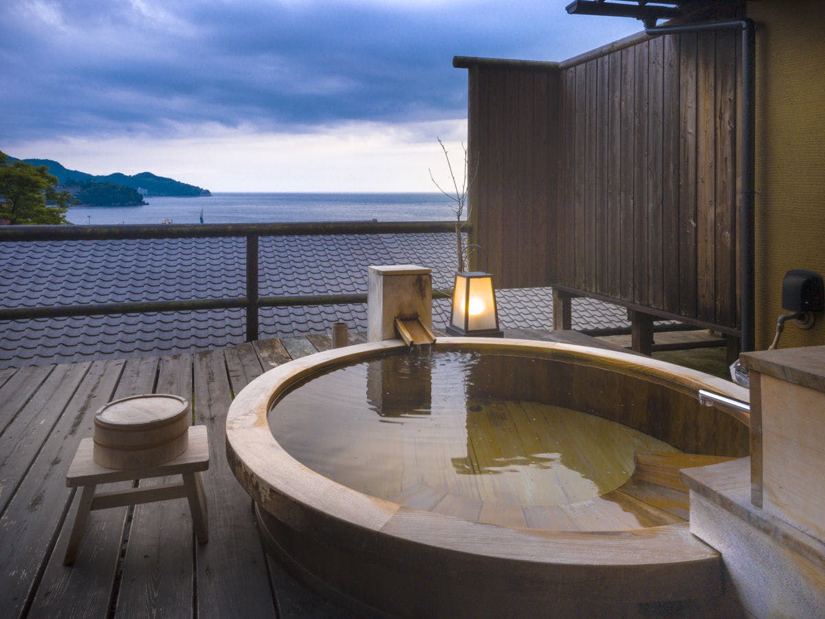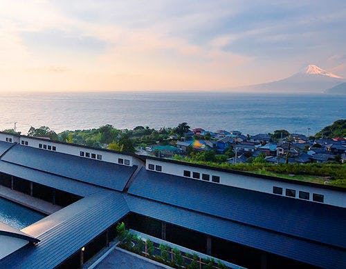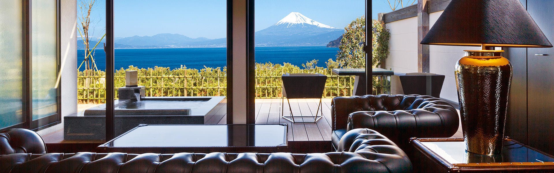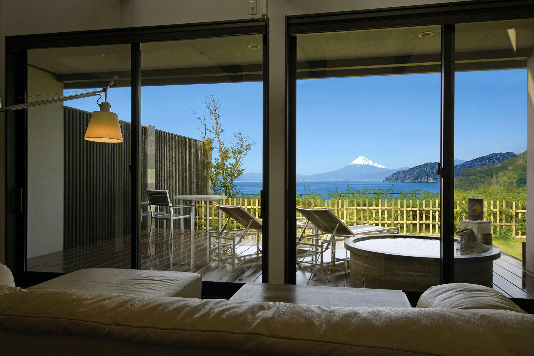 「世界遺産登録 富士山を眺める宿」西伊豆土肥温泉の高台に佇む、わずか8室の客室。贅沢にその空間を堪能しながら、広いデッキテラスに配置されたお部屋の露天風呂から、駿河湾越しの雄大な富士山を眺む。