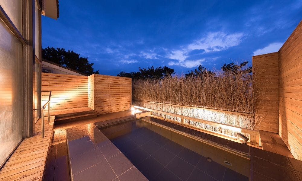 美しい慶野松原の浜辺に佇む和のクラシックリゾート「あわじ浜離宮」の隣接地に新たな魅力の新別荘が誕生。淡路島の素材を活かした特別料理や全室露天風呂付で美肌の湯・潮崎温泉を満喫できる。全室Wi-Fi無料