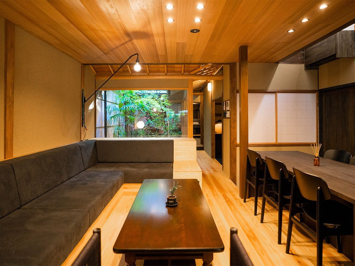 四季を通じて美しい庭園を楽しめる青蓮院門跡の向かい、2階建ての京町家をリノベーションした一棟貸の宿。東山エリアの寺社仏閣巡りに最適なロケーション。最大9名様まで宿泊できます。グループでのお泊りに