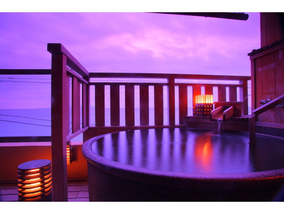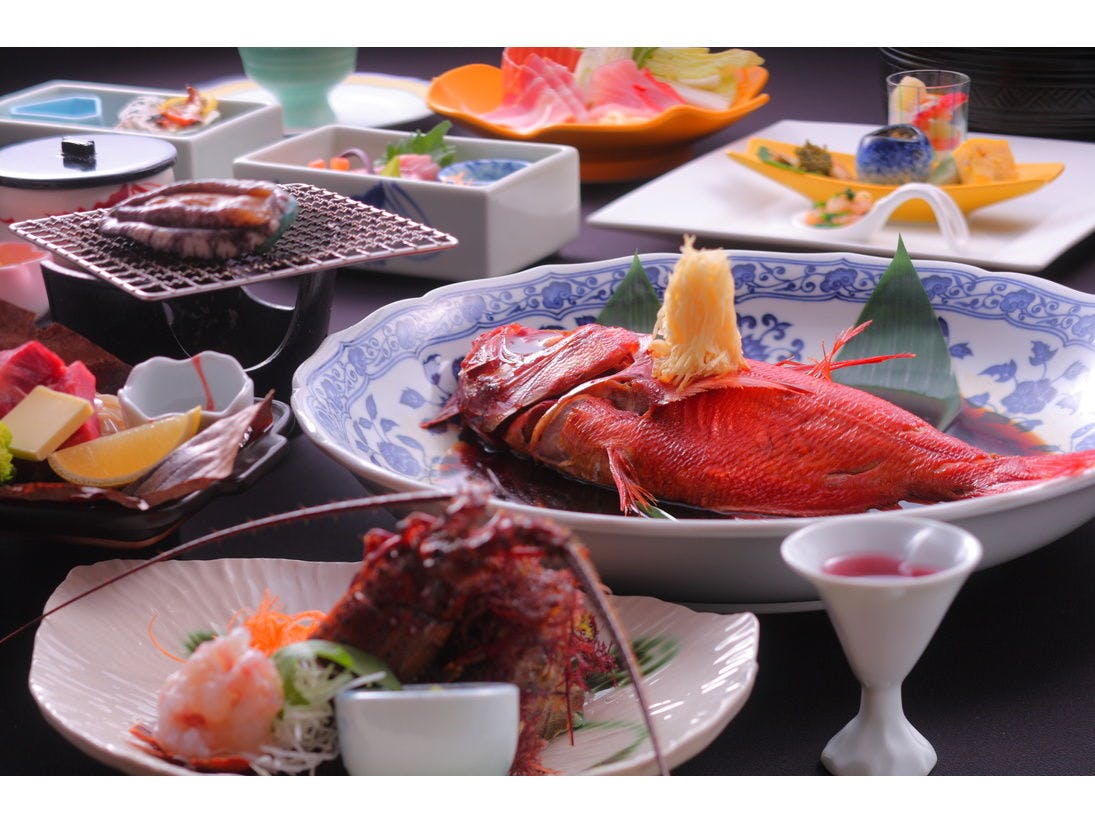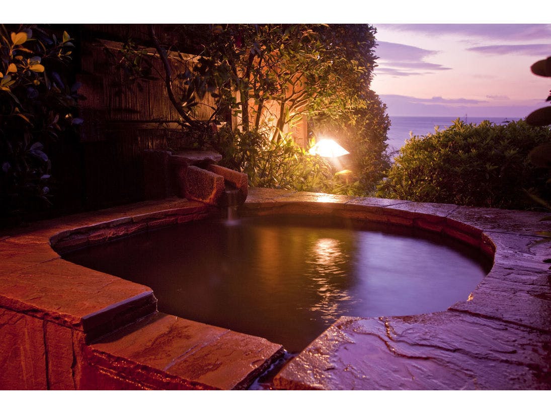 無料で何度も入れる高級貸切露天風呂6つと貸切内風呂1つ、伊豆ならではの新鮮美味な伊勢えび、アワビ、金目鯛など海の幸を満喫、オシャレなお部屋はリピーターが多いポイント
