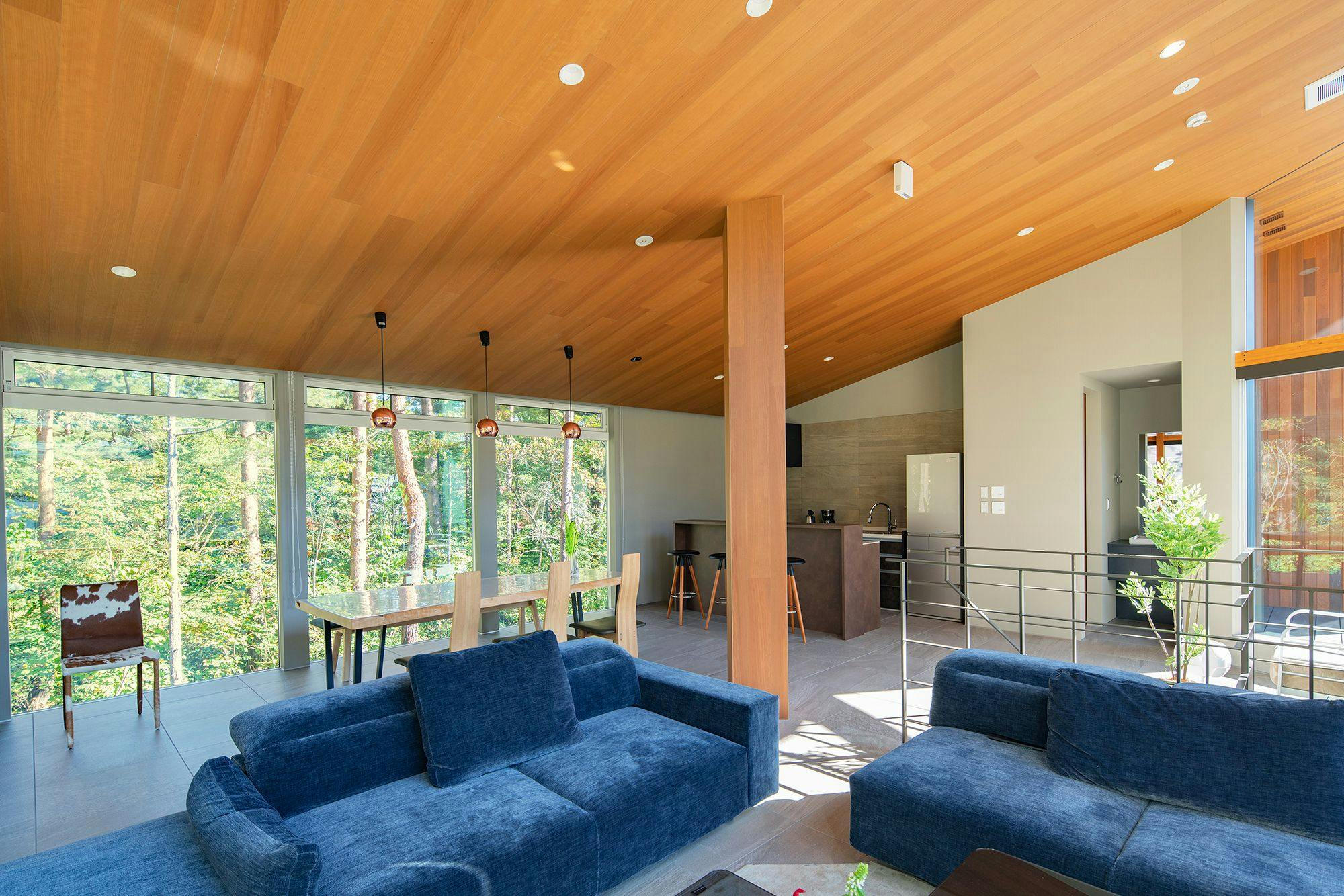 2018年7月NEWオープン!白馬和田野の森に佇む一棟貸しの別荘です。天井高が5mあるリビングルームには大きな窓から木々の緑と光が差し込み、まるで森の中に溶け込むかのようにリラックスしていただけます。