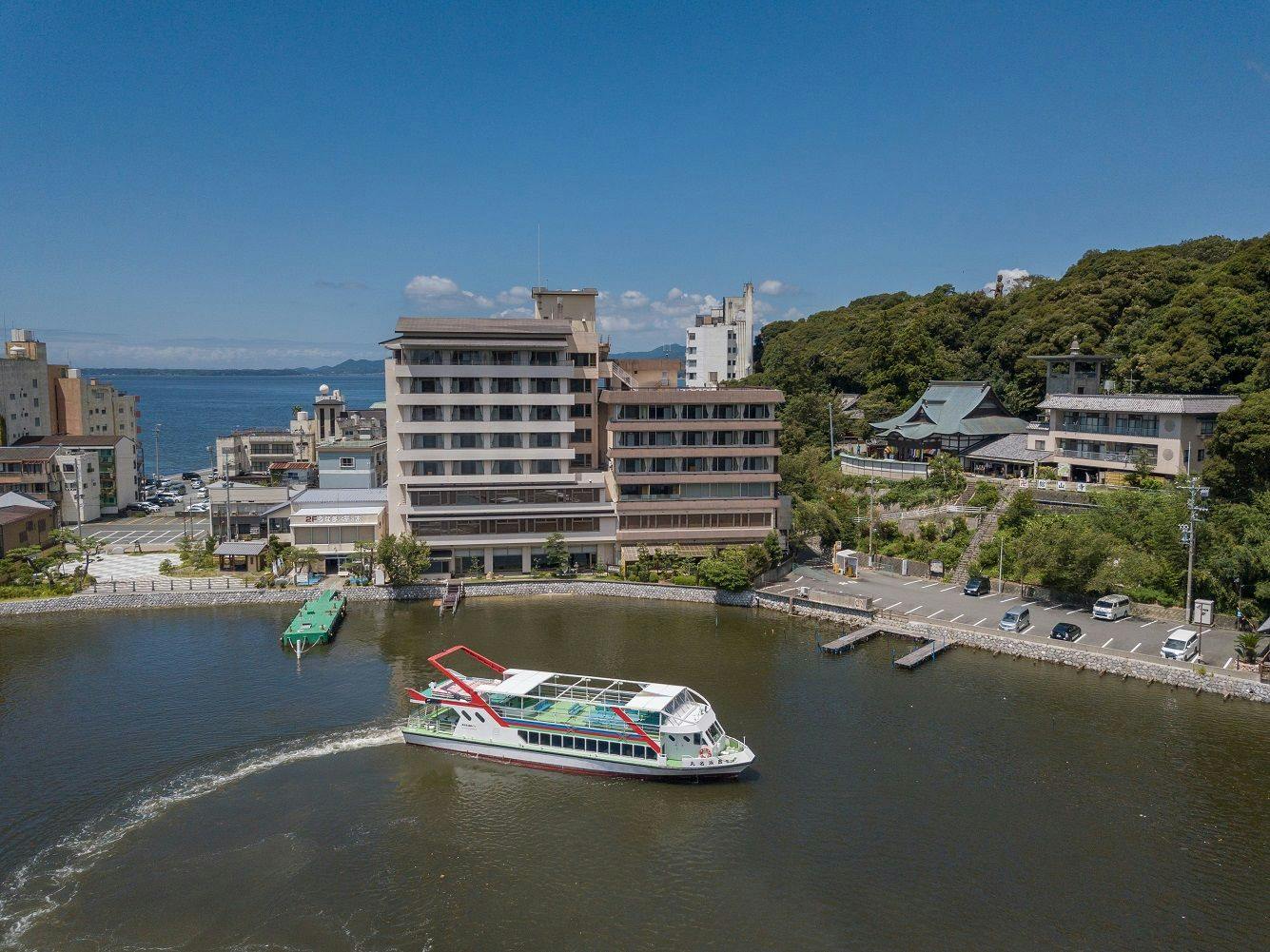 浜名湖かんざんじ温泉に位置するリゾートホテルの雰囲気溢れる温泉旅館。全屋から浜名湖を望め、屋上露天風呂からの景色は浜名湖随一の絶景。夕食は無煙ロースターでグリルと個々盛り料理の会席スタイル。