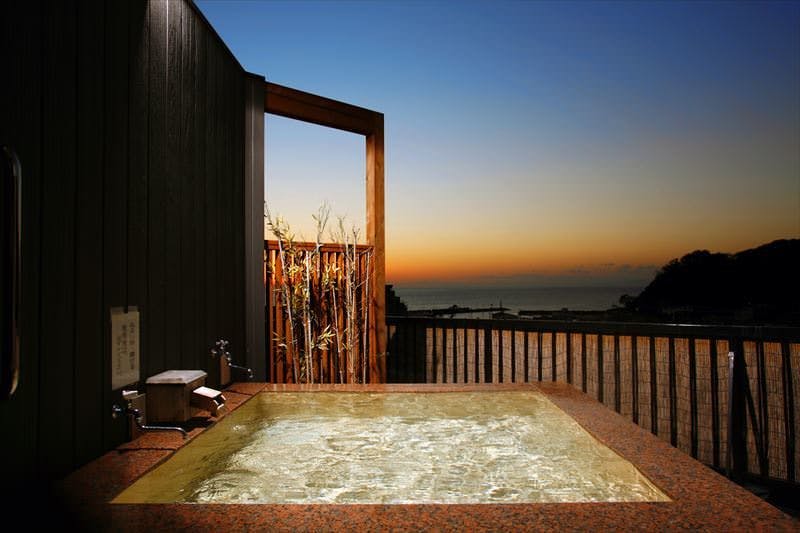 駿河湾と松原を望み、土肥山川のせせらぎ沿いに建つ華やぎの純和風旅館。エリア随一の広さを誇る露天付貴賓室他、趣も様々な露天付客室と、個室料亭またはお部屋でいただく伊豆らしい豪快な海鮮会席を満喫できる。
