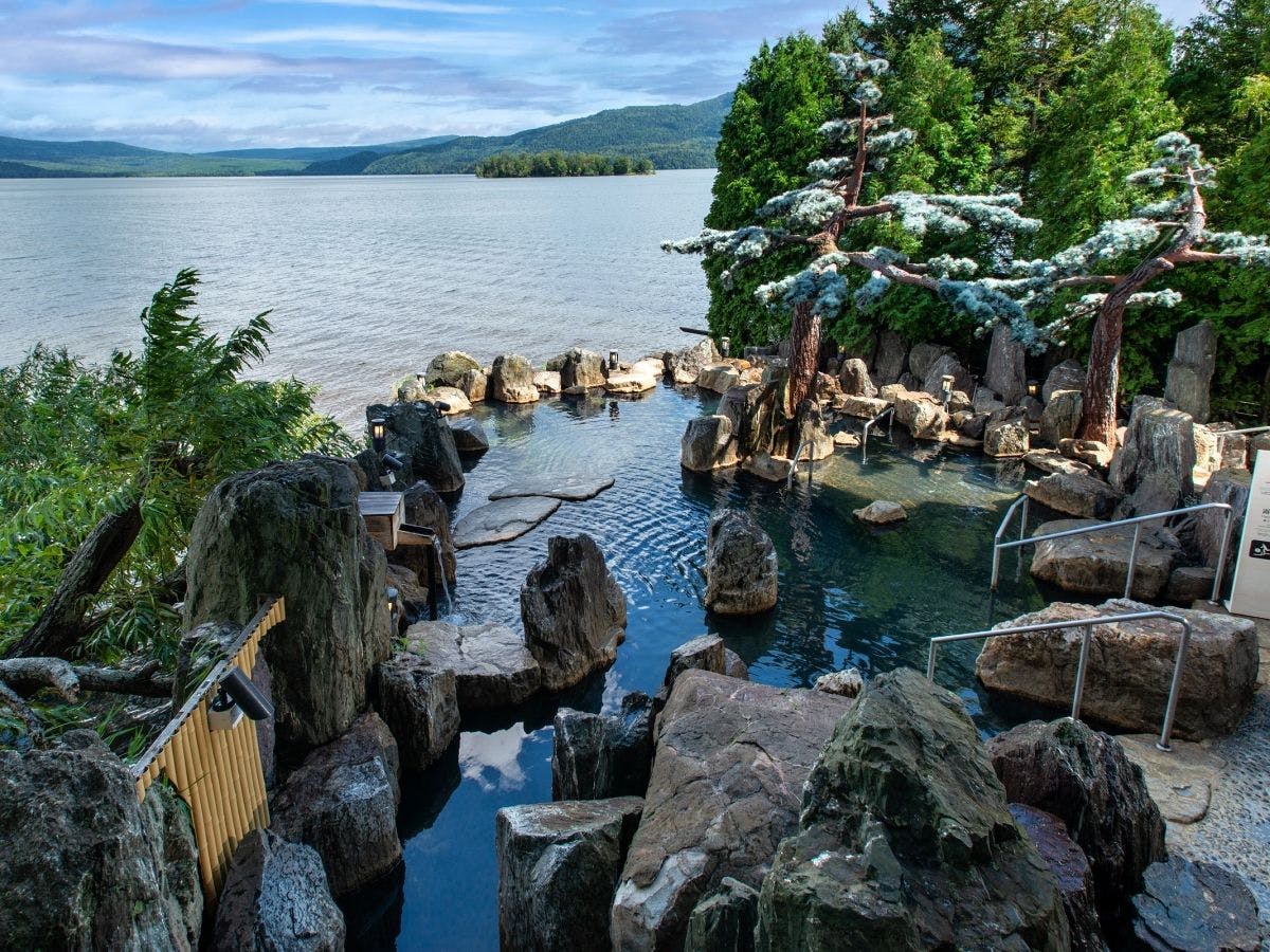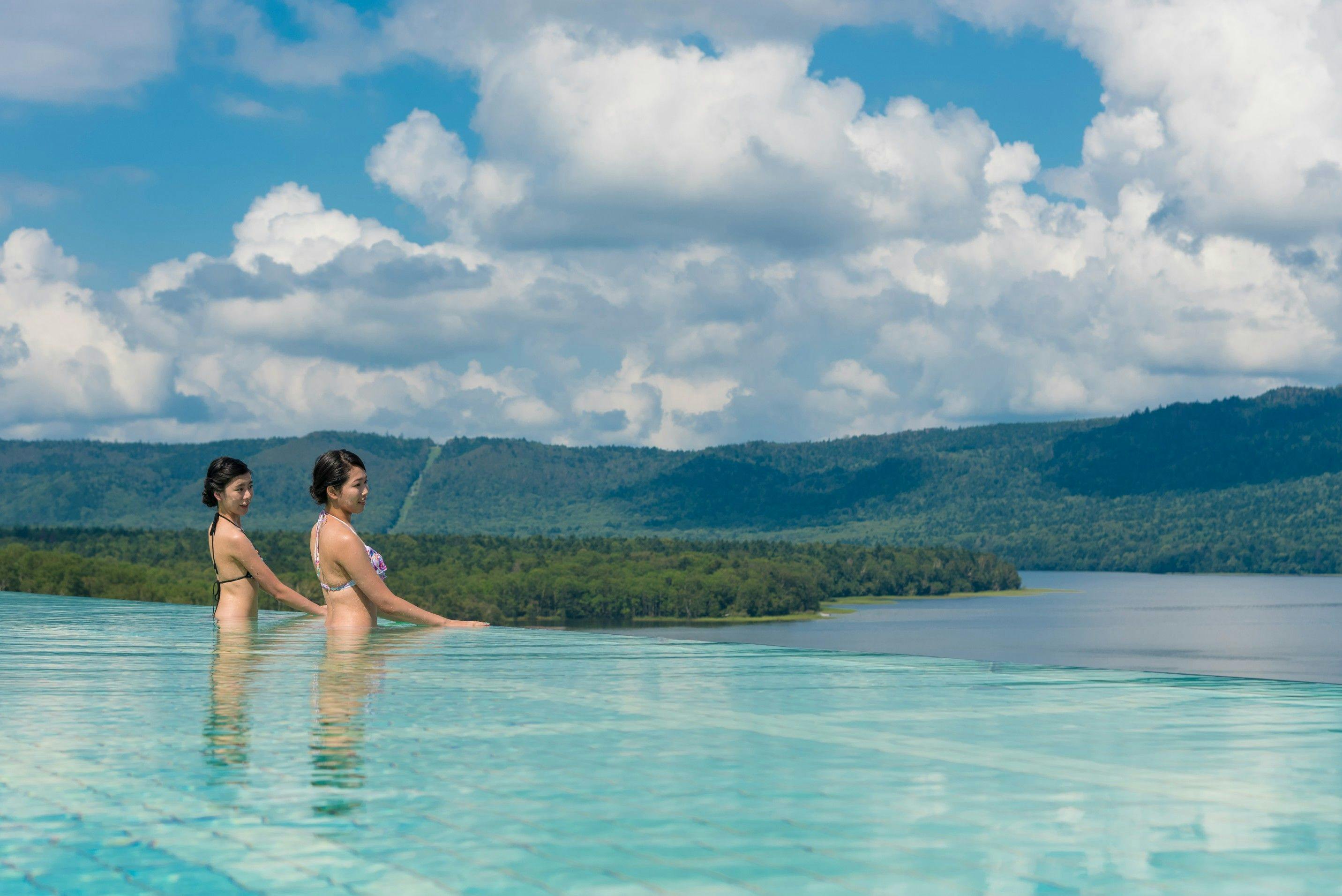 阿寒湖畔に建つリゾートホテル。湖面との一体感を味わえる天空ガーデンスパからの眺めは圧巻。夕食は和洋80品のブッフェ、朝食はお好みで作れる海鮮丼が人気です。開放的な大自然で過ごすリゾートタイムをどうぞ。