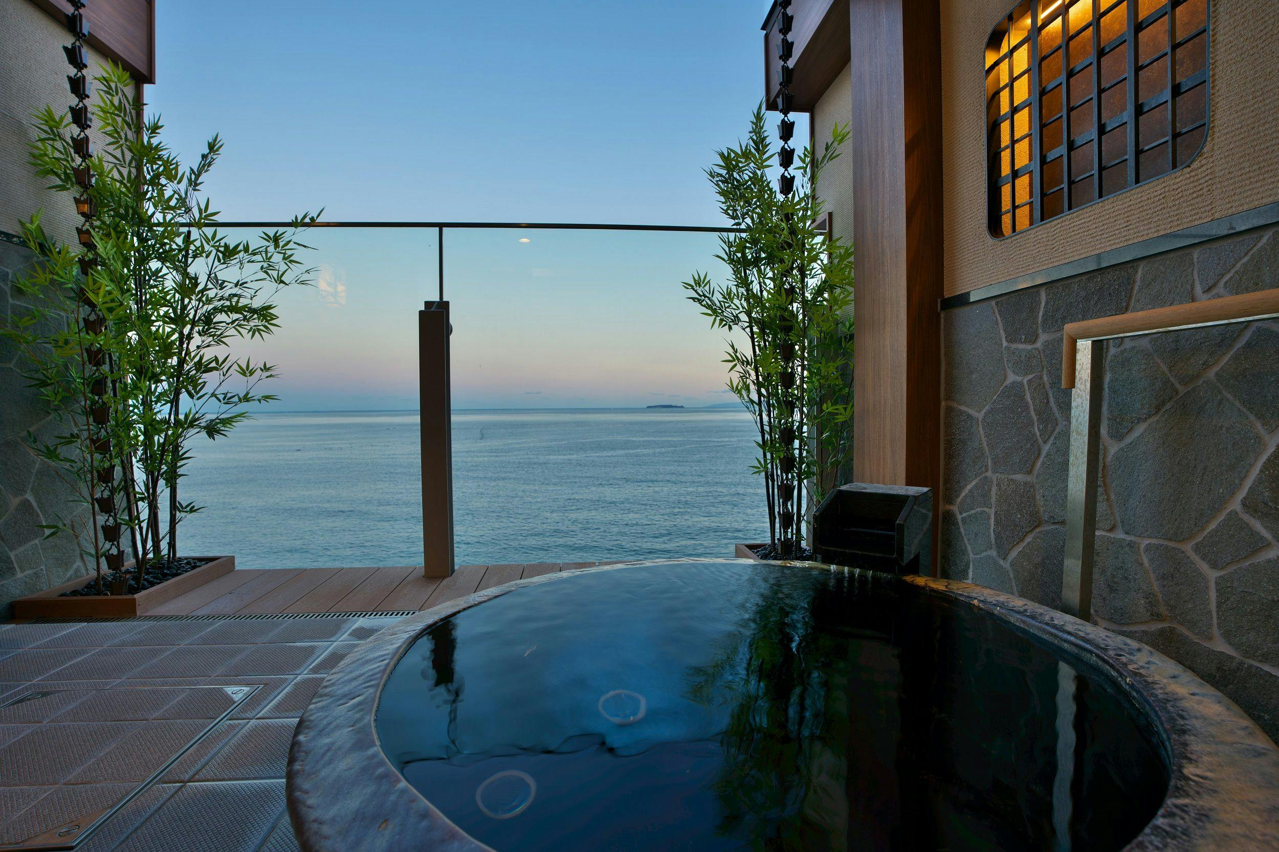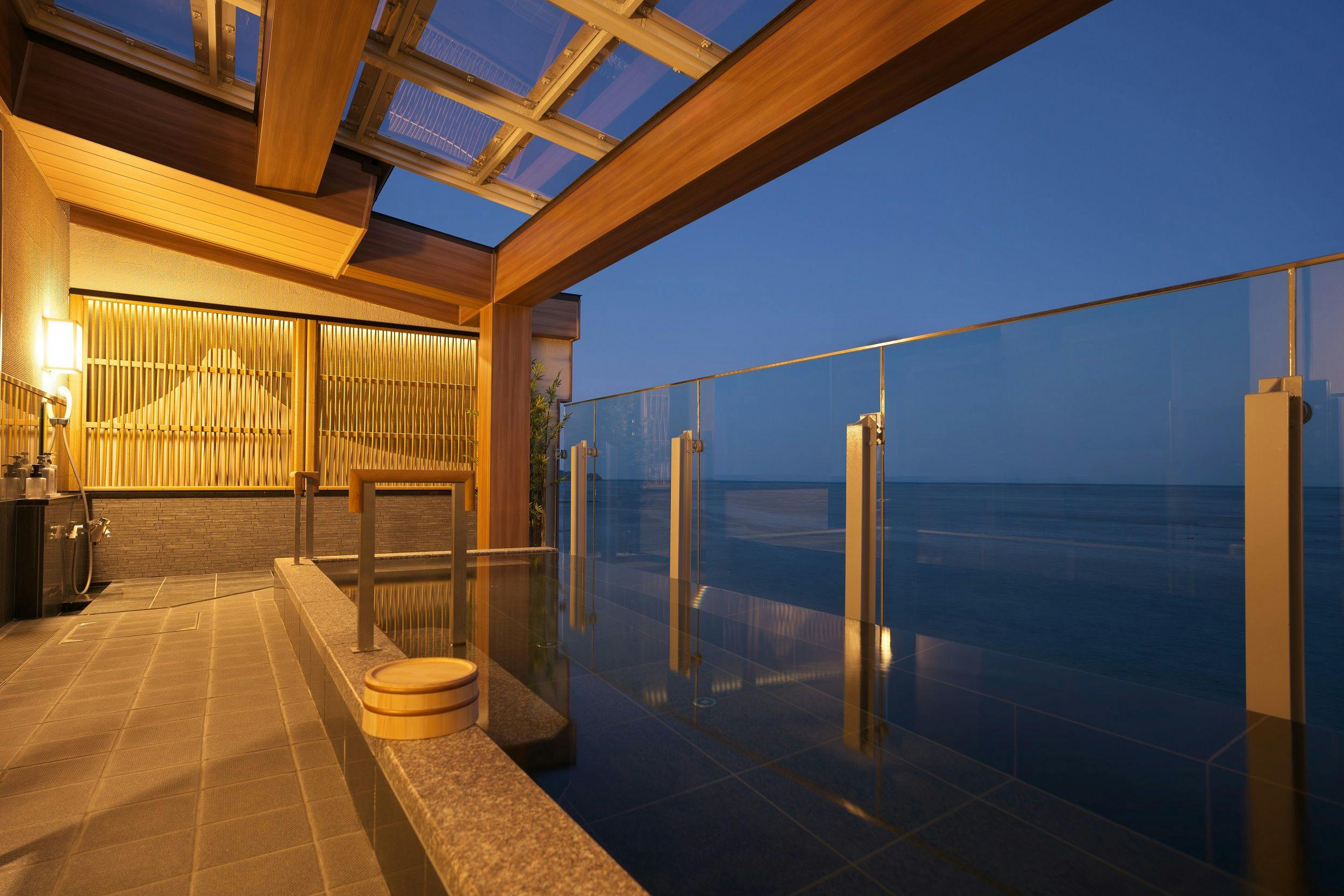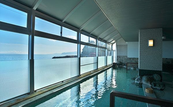 海に挑むやすらぎの宿。全室オーシャンビューのお部屋になります。2つの源泉と3つの貸切風呂があり館内で湯巡りをお楽しみ頂けます。夕食は、伊豆近海の新鮮な海の幸をご堪能ください。