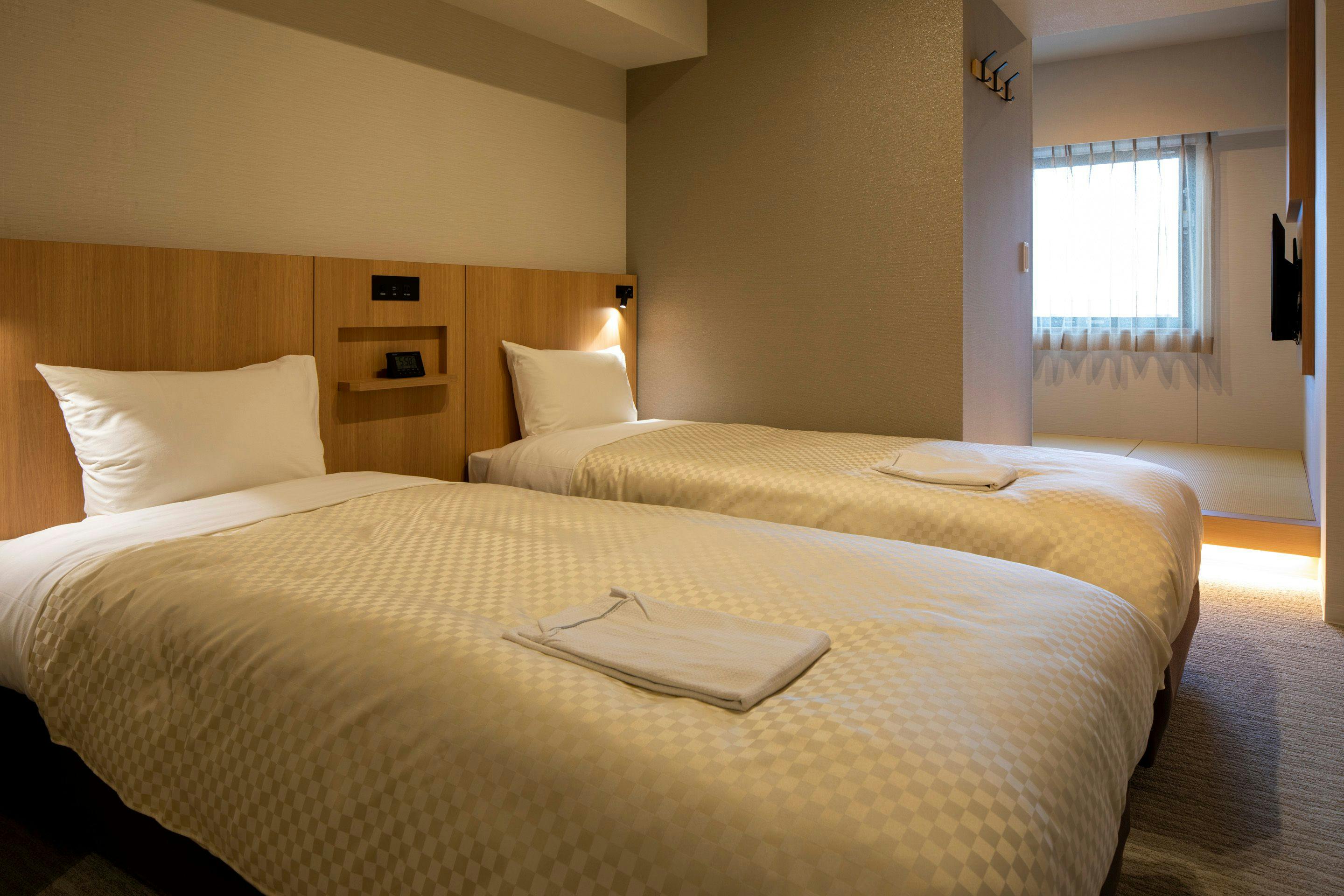 シングルルーム全室に幅142cmダブルベッドを導入。北総線印西牧の原駅前の好立地!
