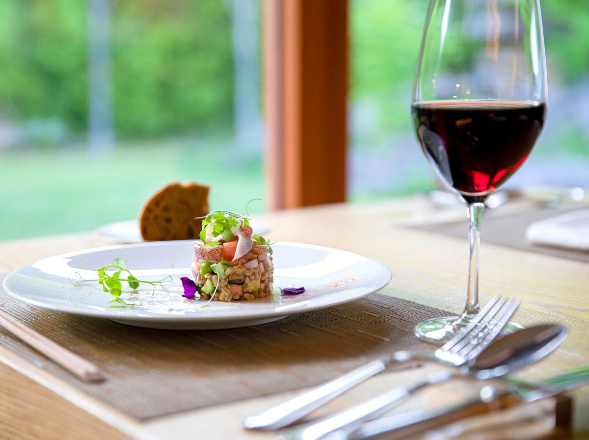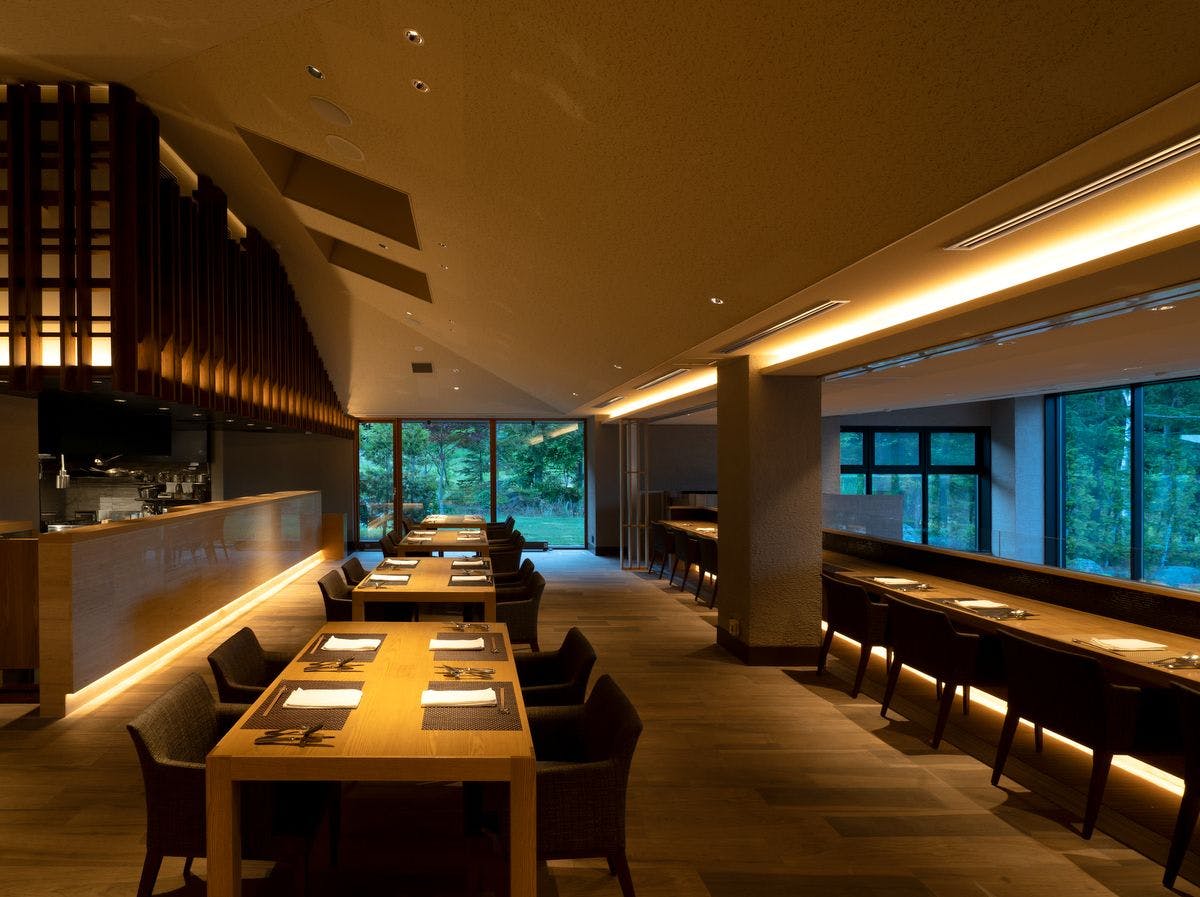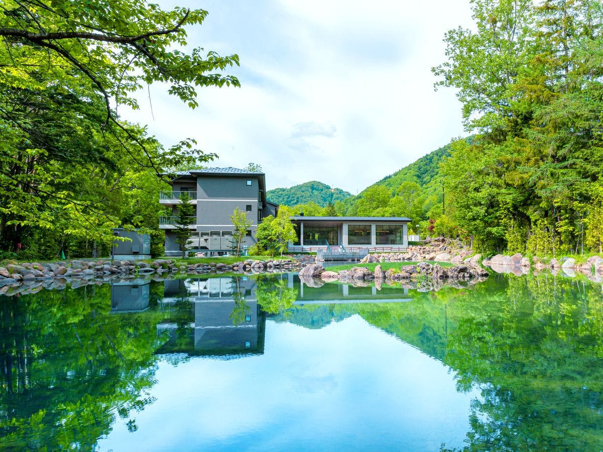 木の温もり溢れる和風モダンなしつらえは「森の隠れ家」的。滾々と湧き出る温泉、地元や道内産の食材にこだわり季節感を添えた料理をニセコの自然と共に味わえる。