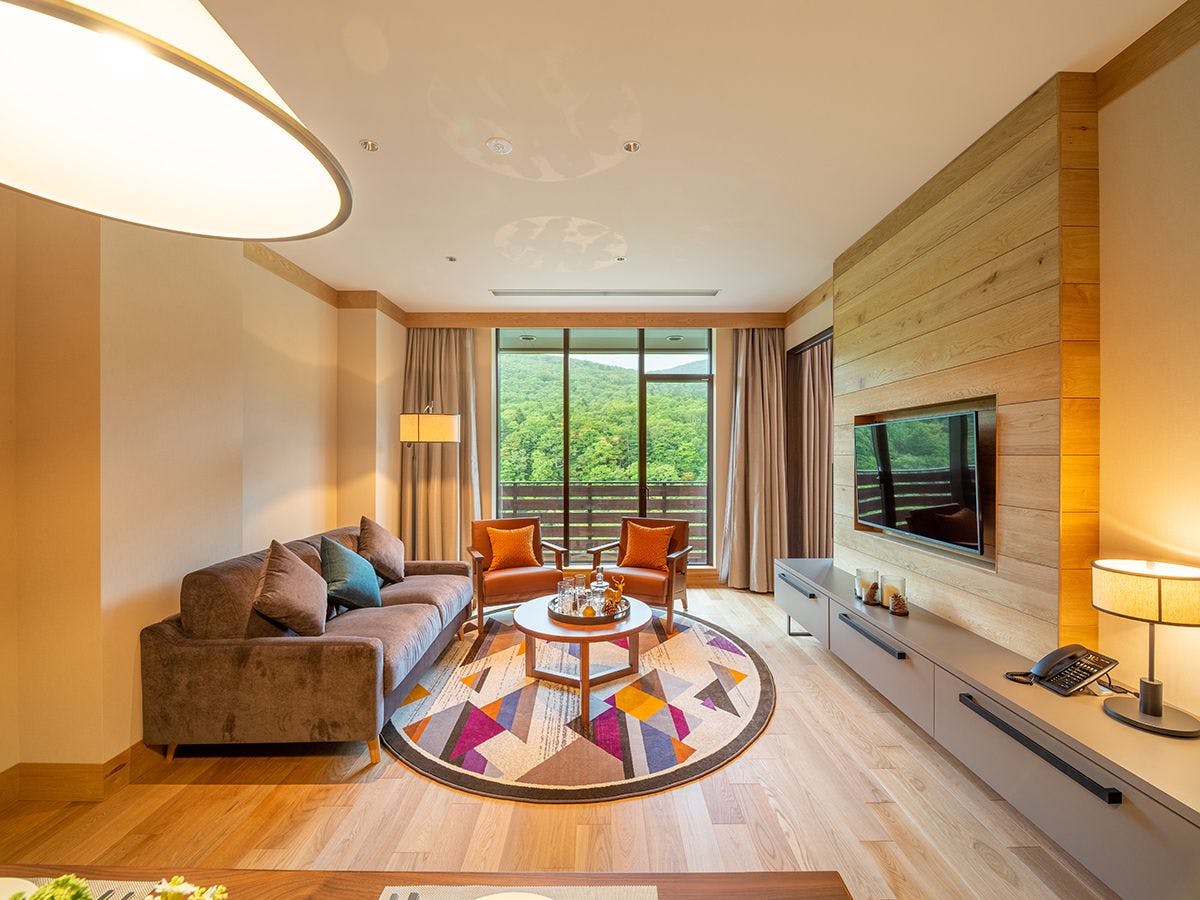 ニセコ東山の別荘地「Fox Wood」開放的な窓からの静かな景色、優しい木のぬくもりにあふれた室内。ゆったりと贅沢な時間をお過ごしください。