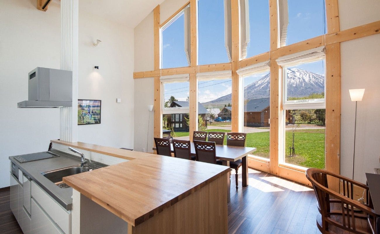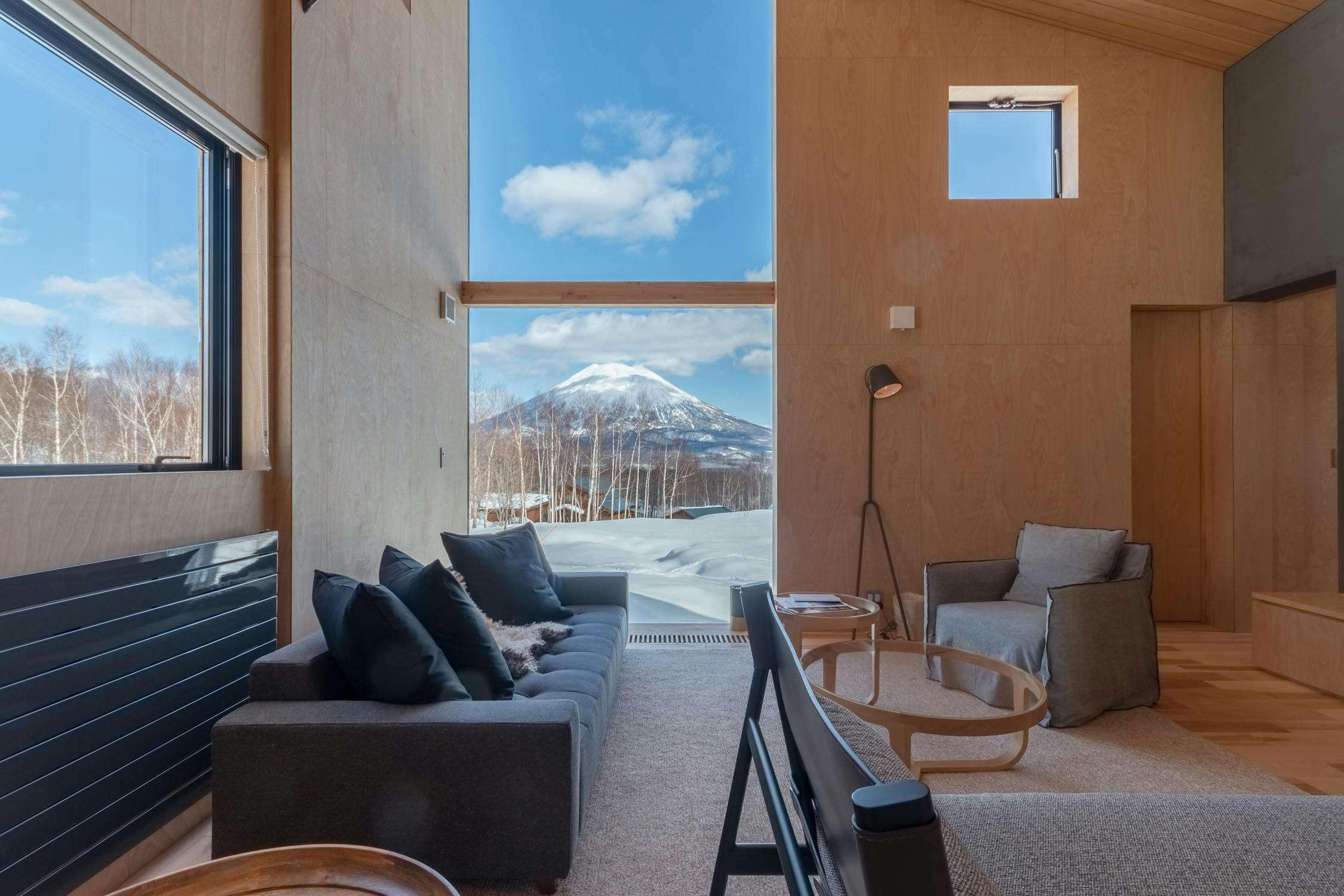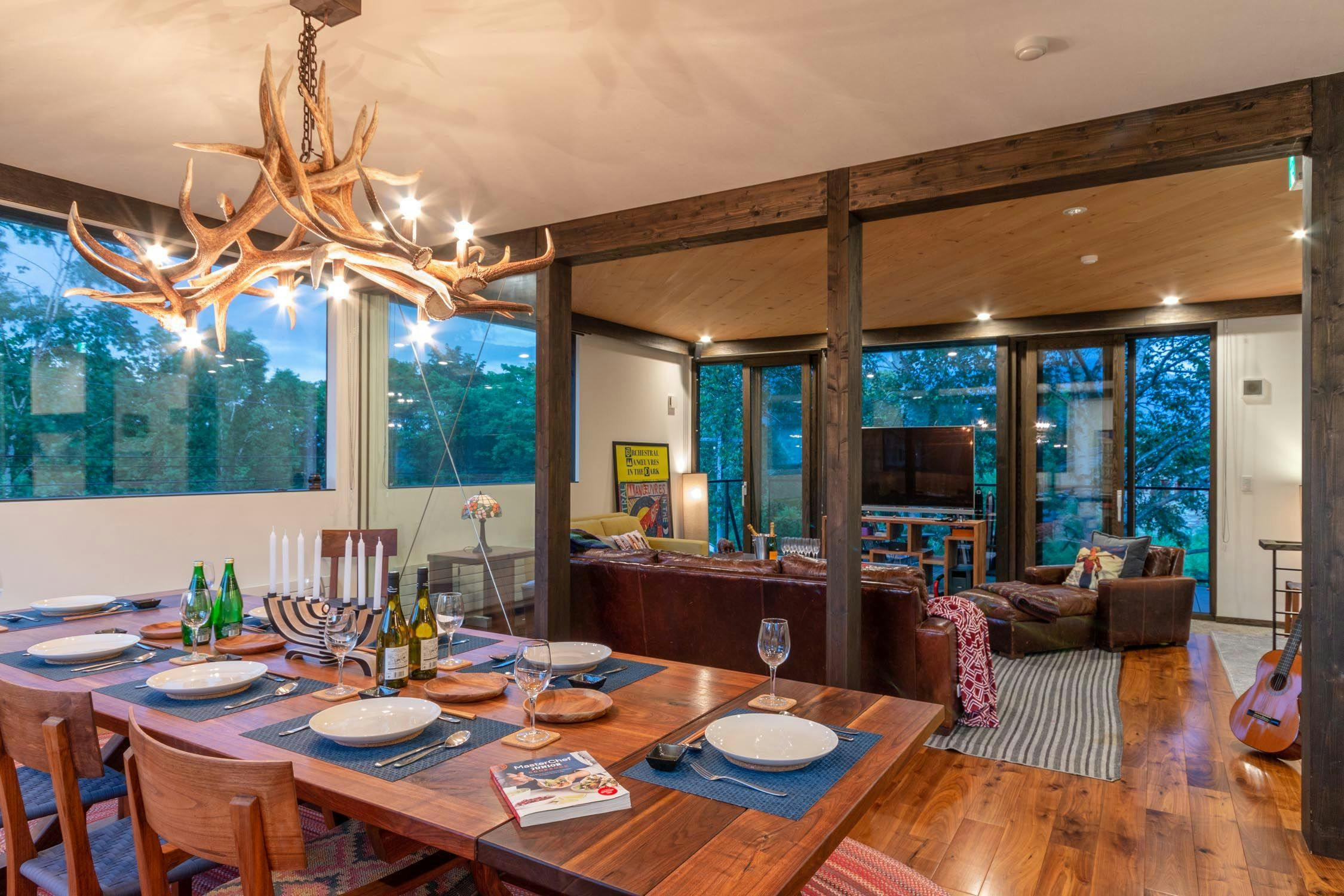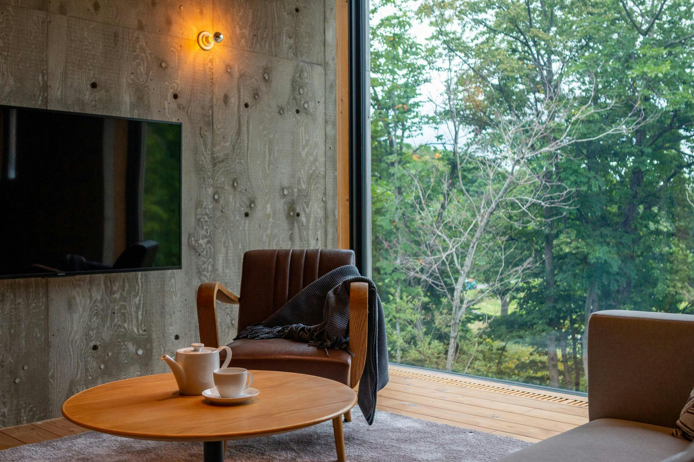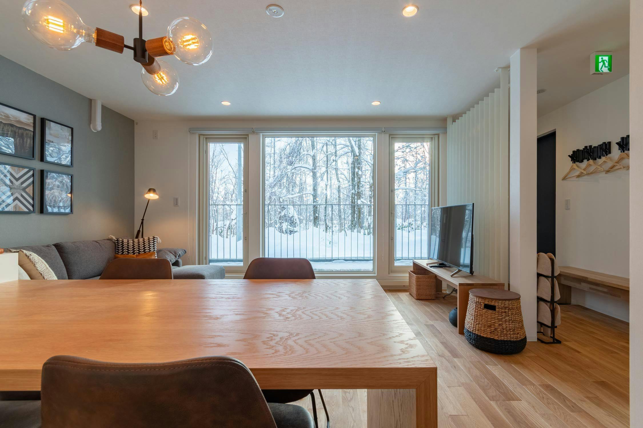 ニセコ東山の別荘地「Fox Wood」開放的な窓からの静かな景色、優しい木のぬくもりにあふれた室内。ゆったりと贅沢な時間をお過ごしください。