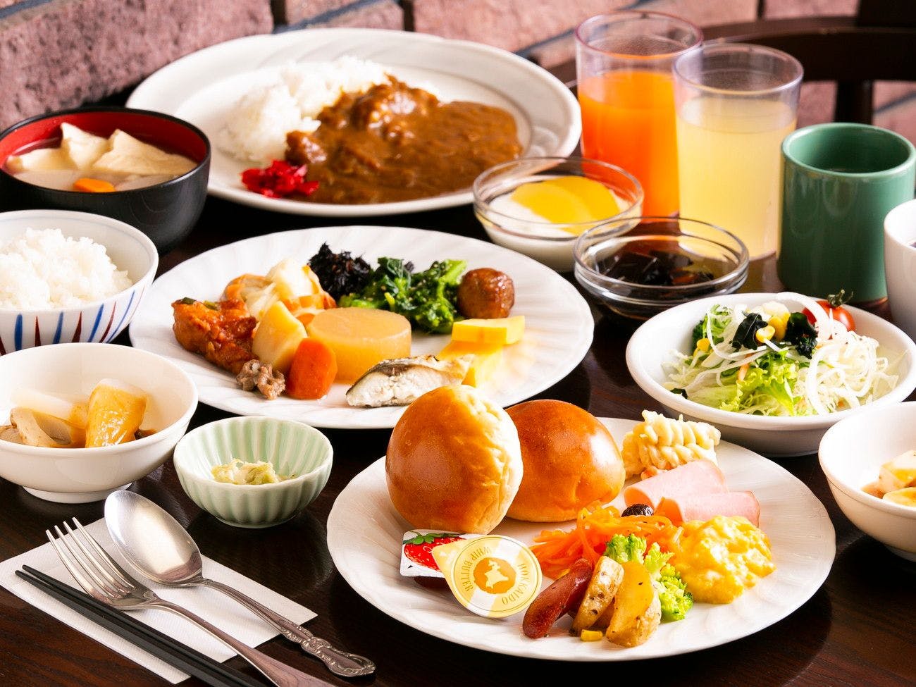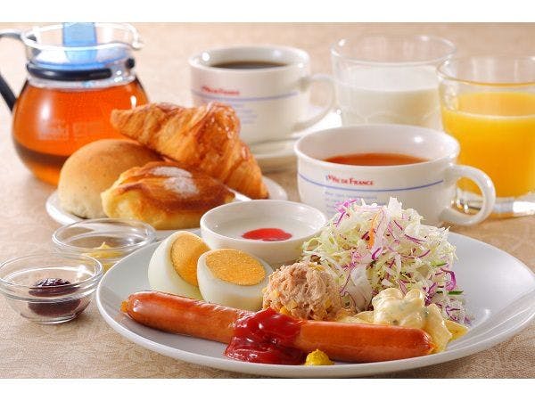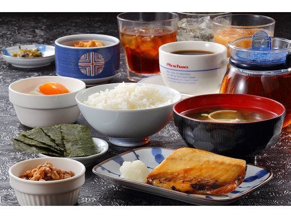 ピカピカの「つや姫」&「芋煮」「玉こん」など郷土料理&シェフのふわふわオムレツが好評の朝食バイキングはオープンキッチンのダイニングで。全室有線&無線LAN完備。加湿空気清浄機も全室完備。