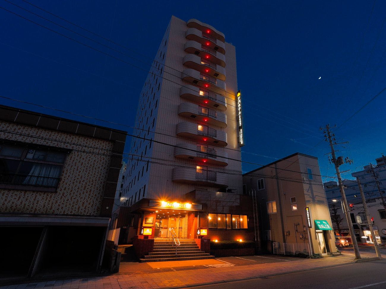 JR青森駅東口より徒歩5分。ベイエリアの中間に位置し、ビジネス・観光にも最適。全室Wi-Fi/有線LAN接続無料・BBCワールドニュースの無料視聴が可能、VOD「アパルームシアター」無料で見放題。