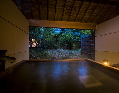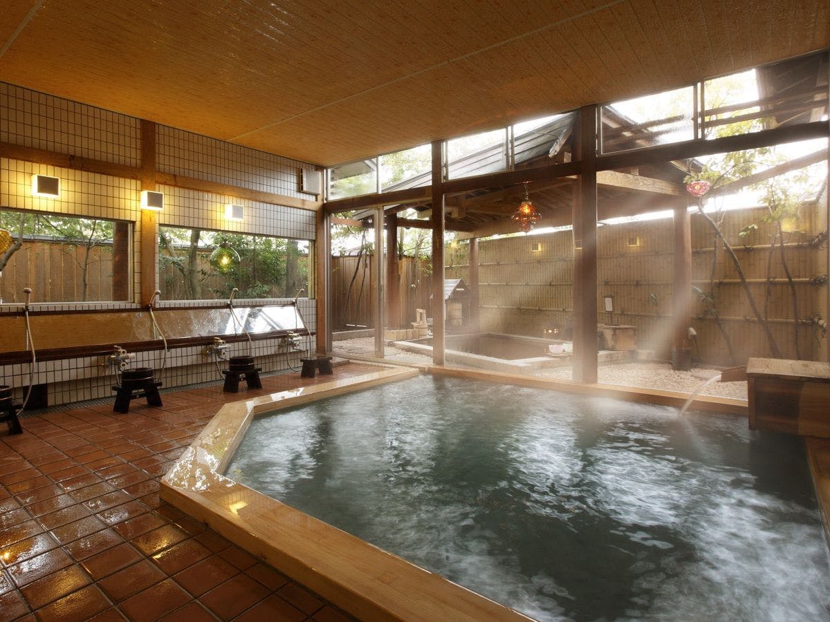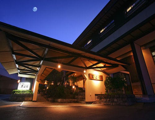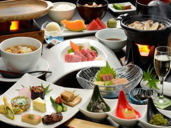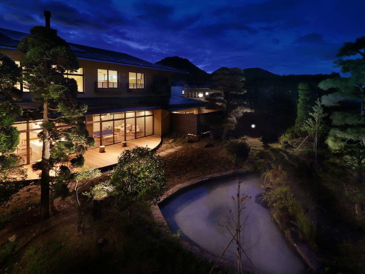 花とあかりをコンセプトにした幻想的な館内。目にも鮮やかな夕食は郷土色豊かな懐石料理。出来立てをご提供。源泉かけ流しの檜露天では湯船に浮かぶ花明りの風情をお愉しみ