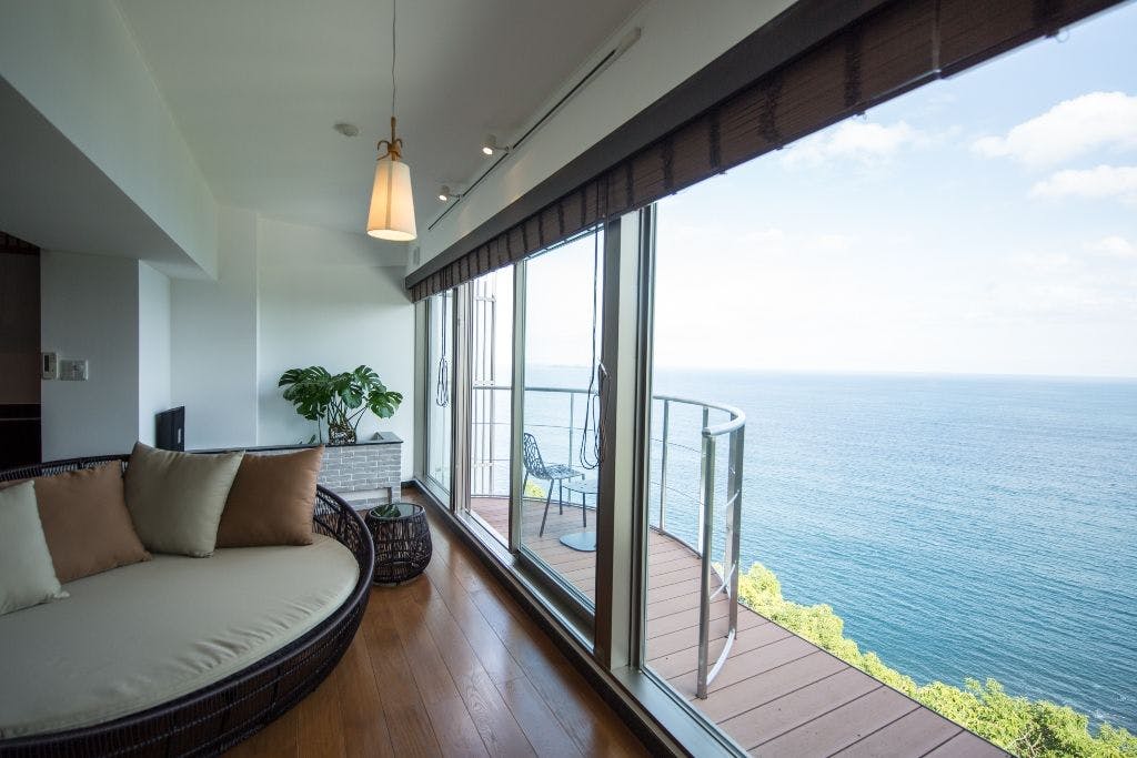 沖に浮かぶ大島を眼前に太平洋を一望できるおちついたお部屋。海へせり出すように設えたPrivateGazebo「ときの凪」-海鮮料理に舌づつみする豊かな時を