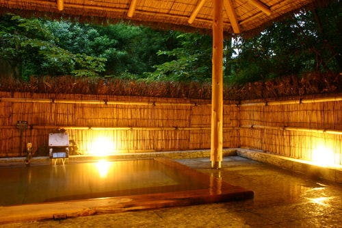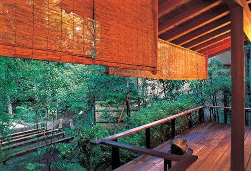 修善寺に500年以上続く温泉宿。水と緑に囲まれた野外能舞台、竹林と池を望む野趣豊かな野天風呂。地元の旬の素材の料理。自然の光・音・空気を取り入れた部屋。