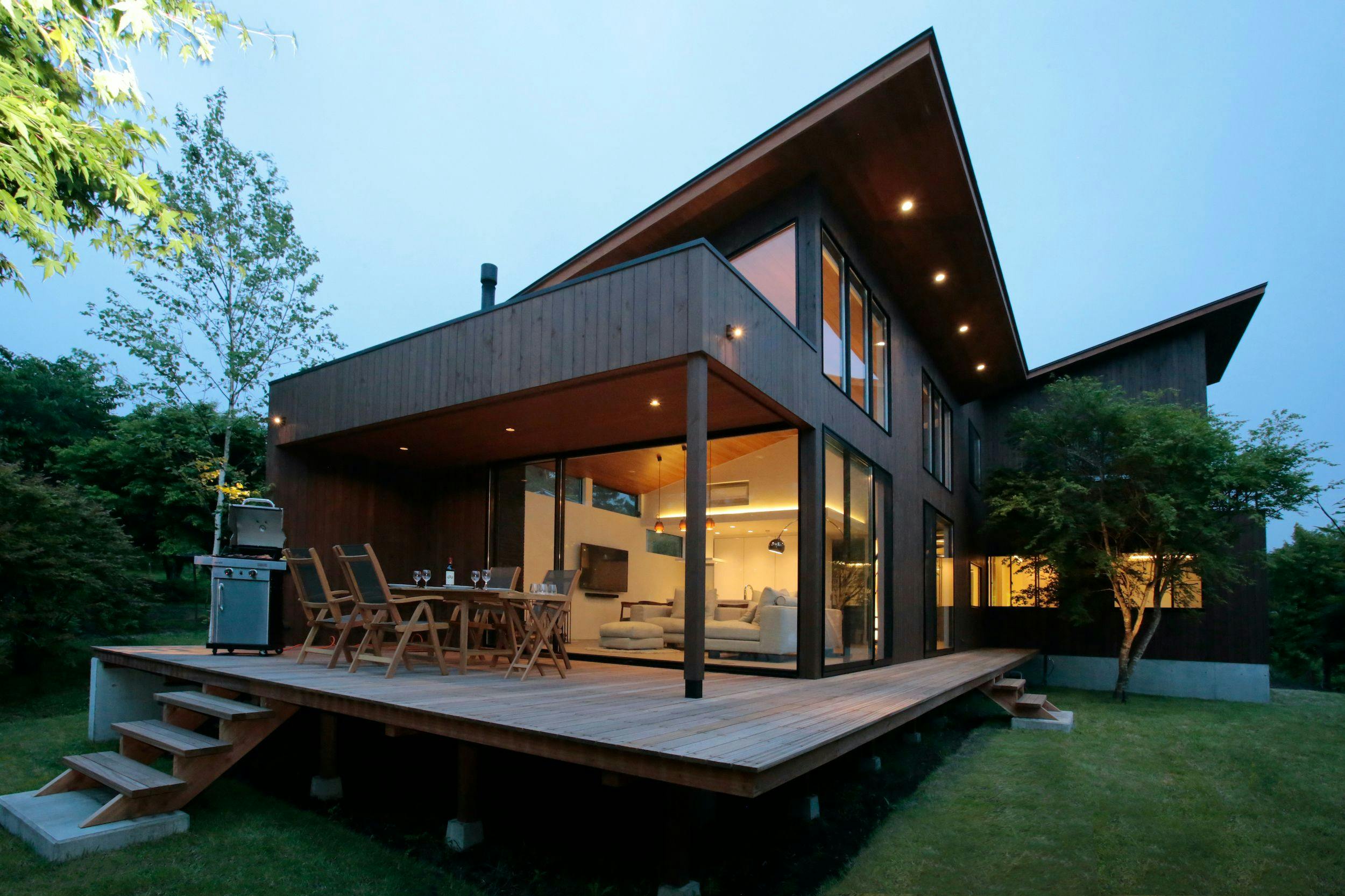 森の中の別荘に泊まる350坪の敷地内に2階建の新築貸し別荘です。焚き火が楽しめるデッキ、屋根付きの屋外スペースも完備されています。