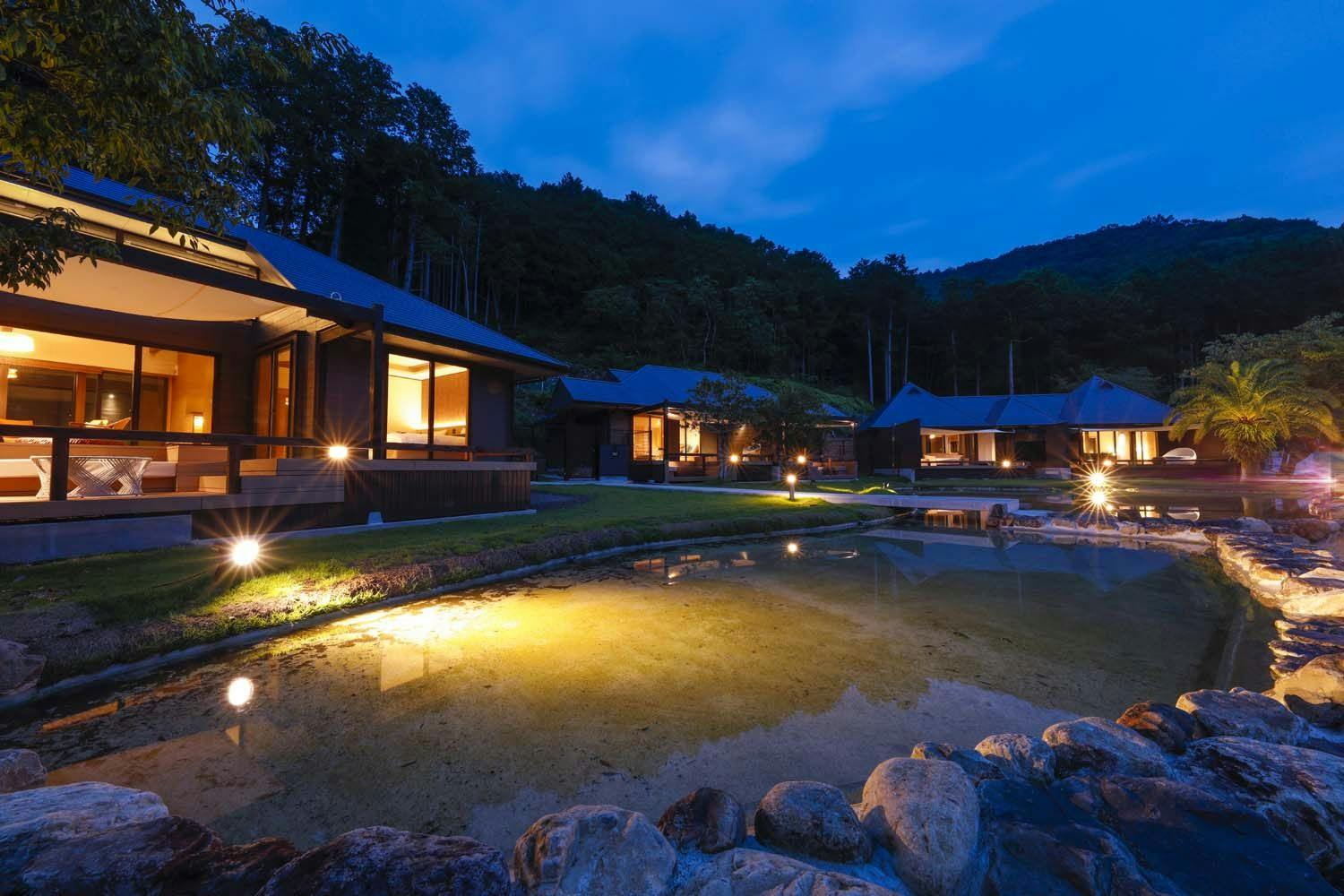 土、石、漆喰、木、漆、和紙、硝子、鉄の8つの素材をテーマにし、源泉掛け流しの露天風呂をしつらえた12のヴィラを持つ美術館のような宿。お食事は素材を生かした美味と滋味をお楽しみください。