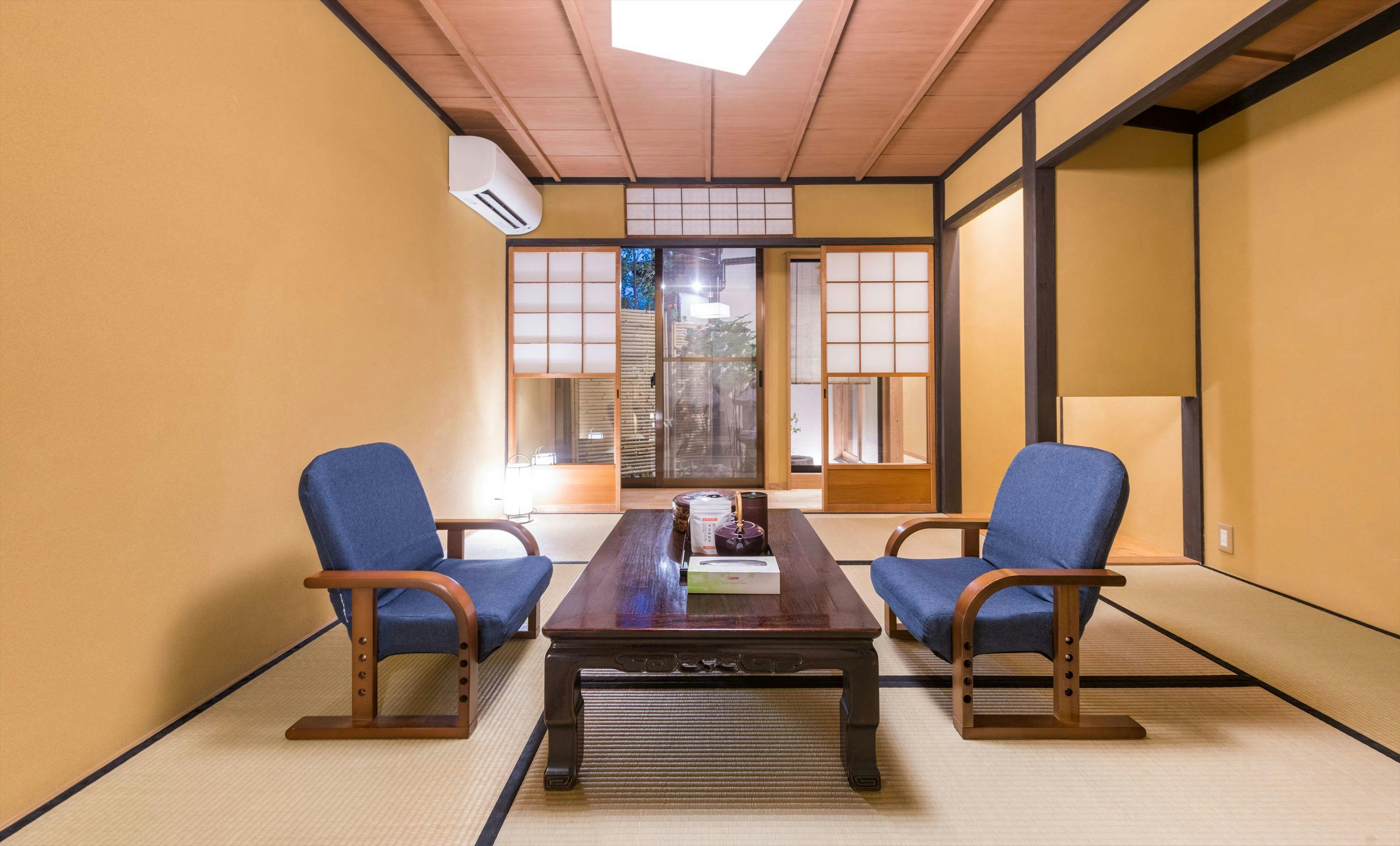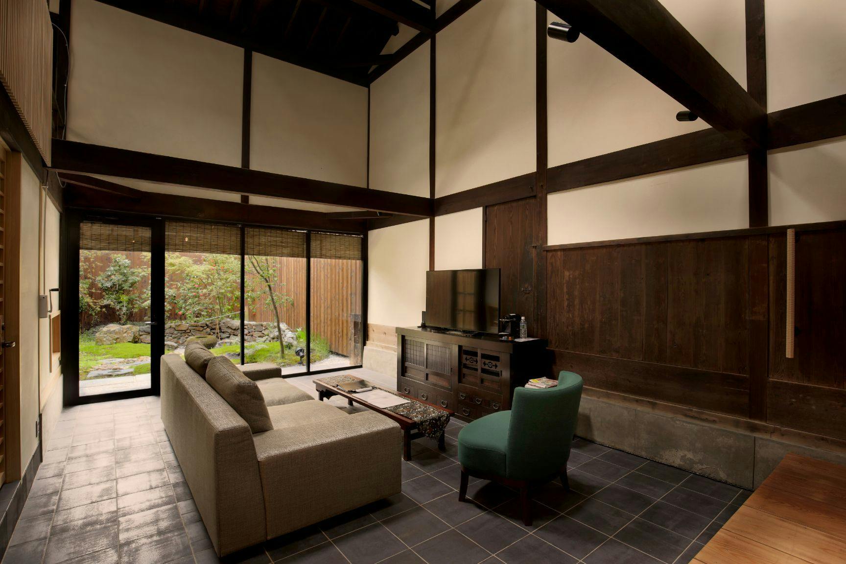 最大6名様までご宿泊いただける、広々とした大空間。吹き抜けの開放的なリビングルームで、大切なご家族やご友人と特別な時間をお過ごしください。露天風呂からは坪庭を眺めることができます。