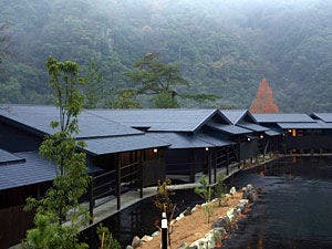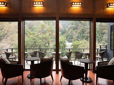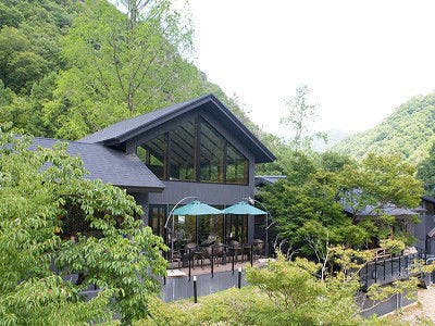 自然を独占、武庫川の渓流を望む大浴場露天風呂付。春は桜、秋は紅葉が絶景、敷地1万坪に12棟のプライベート掛け流し温泉付離れ。別荘タイプで大人の隠れ家。食事は渓谷美が楽しめる半個室レストランで。