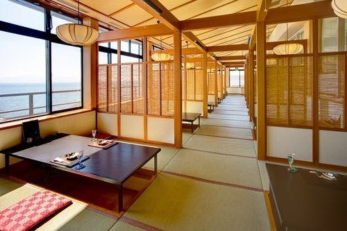 独自に掘り出した自家源泉の湯宿。壮大な日本海の絶景を望む露天風呂は、まるで大海の湯に浸かっている様な感覚。海沿いのレストランで山陰の味覚に舌鼓を打ち、水に浮かぶ幻想的な空間で時を忘れてお楽しみ下さい。