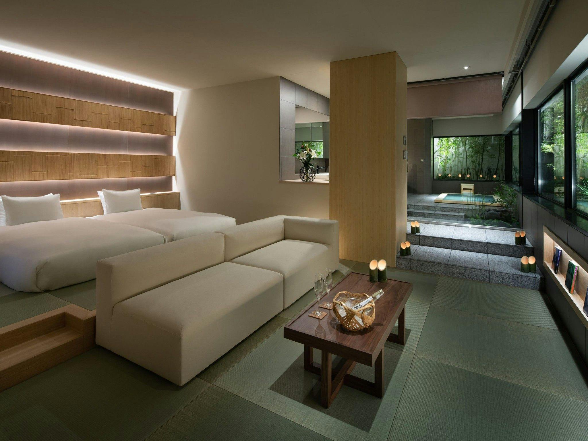 京都駅から10分、有名な京都御所へも徒歩圏内の好立地。歴史ある邸宅「三条烏丸御所」跡に佇み、敷地には日本庭園が広がる。朝食おばんざいなど、食でも京都を満喫。小さな庭園を眺めて入る浴場も人気です。