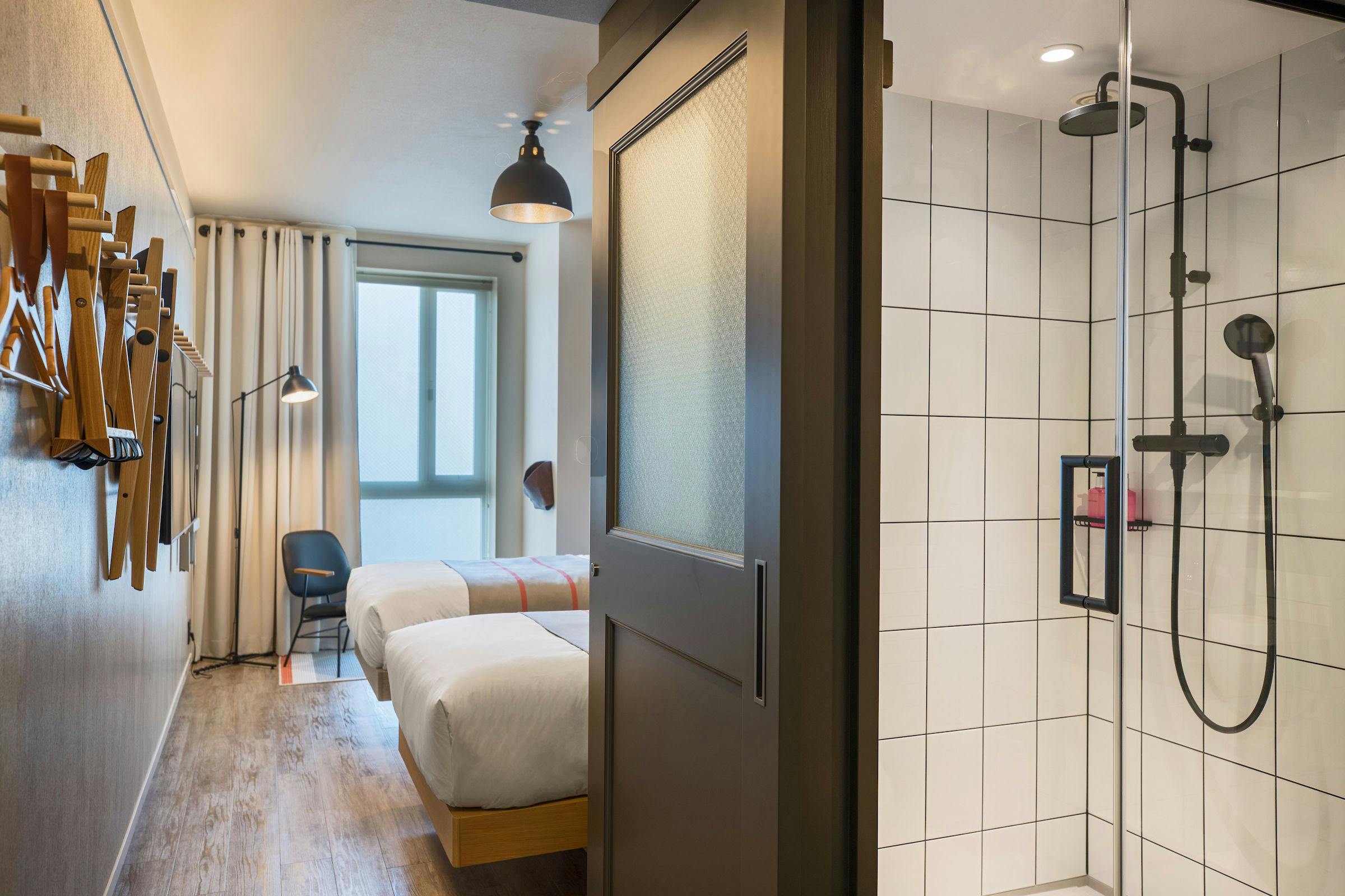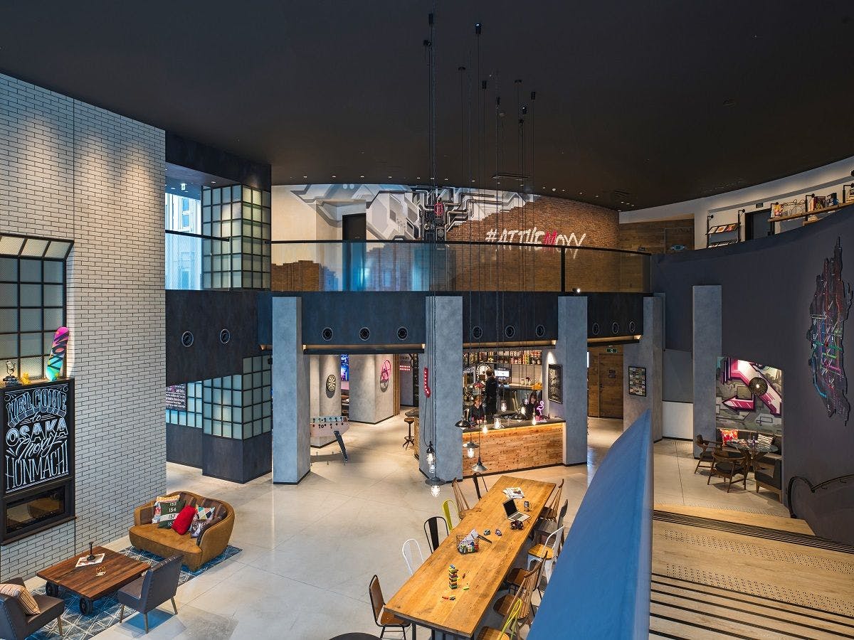 堺筋本町駅より徒歩5分。アーティスティックなホテルデザインのモクシー大阪本町は、2階まで吹き抜けのロビーラウンジに24時間営業のカフェバーやフィットネスジムなどを併設!ホテルステイはあなた次第!