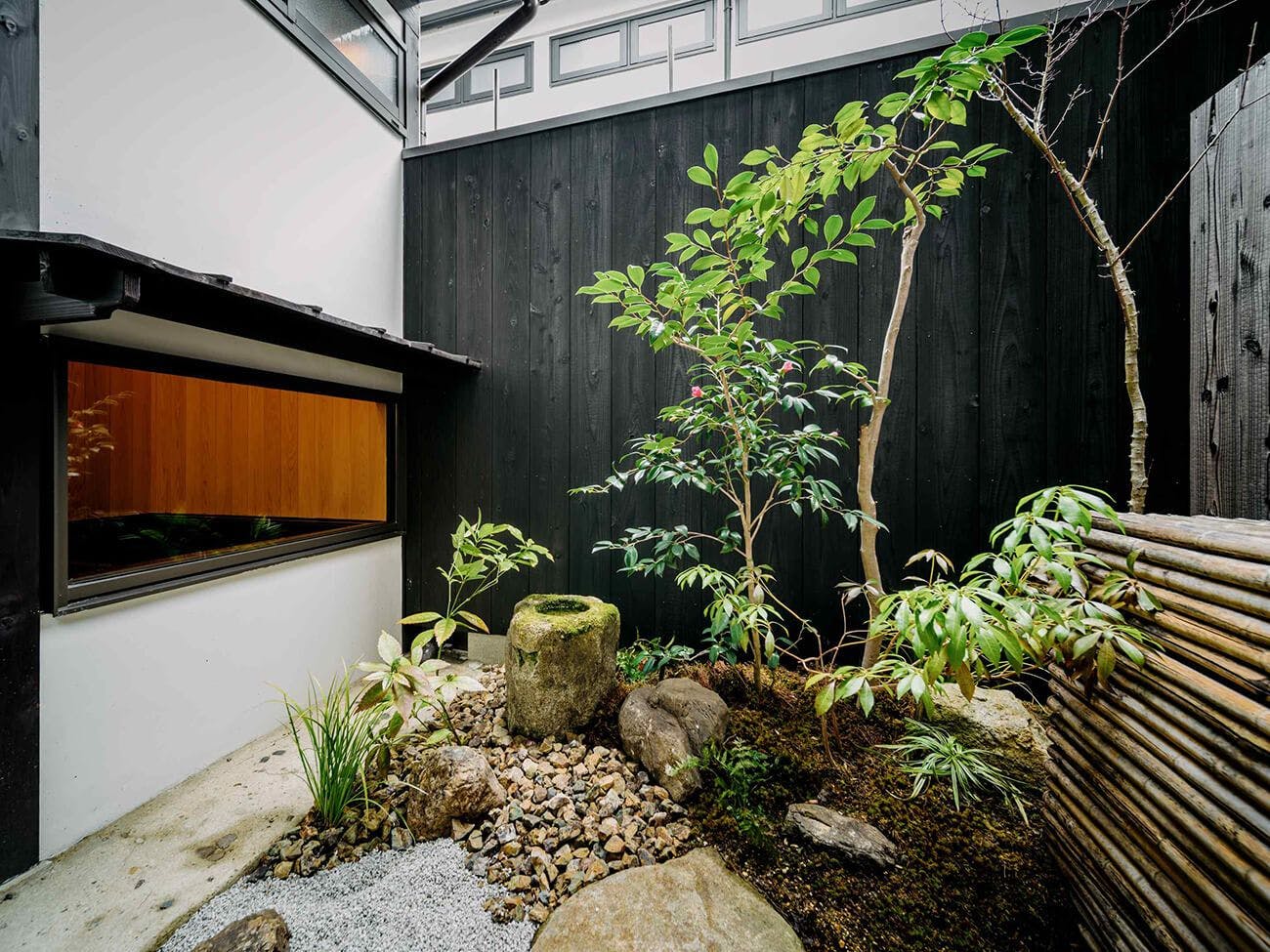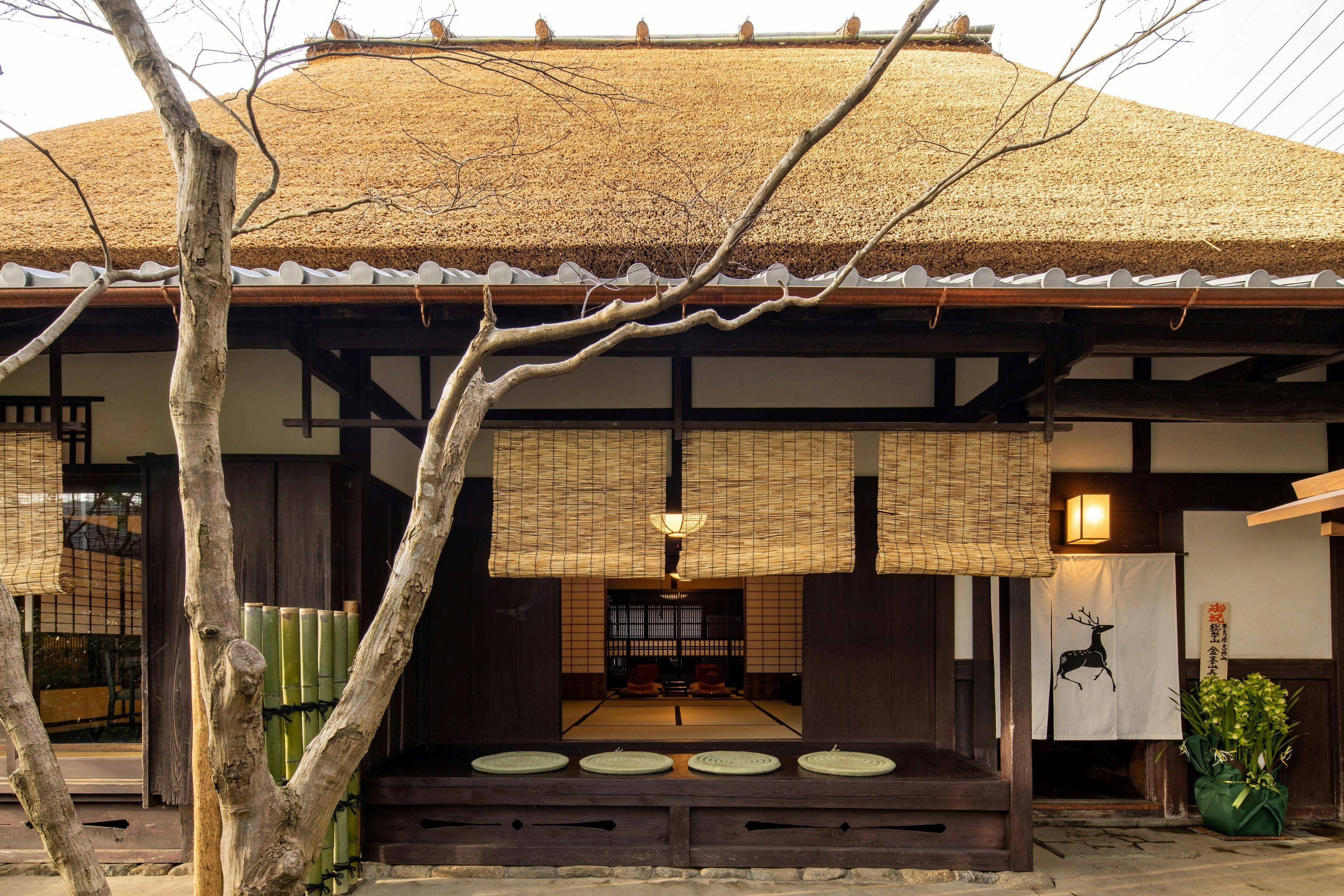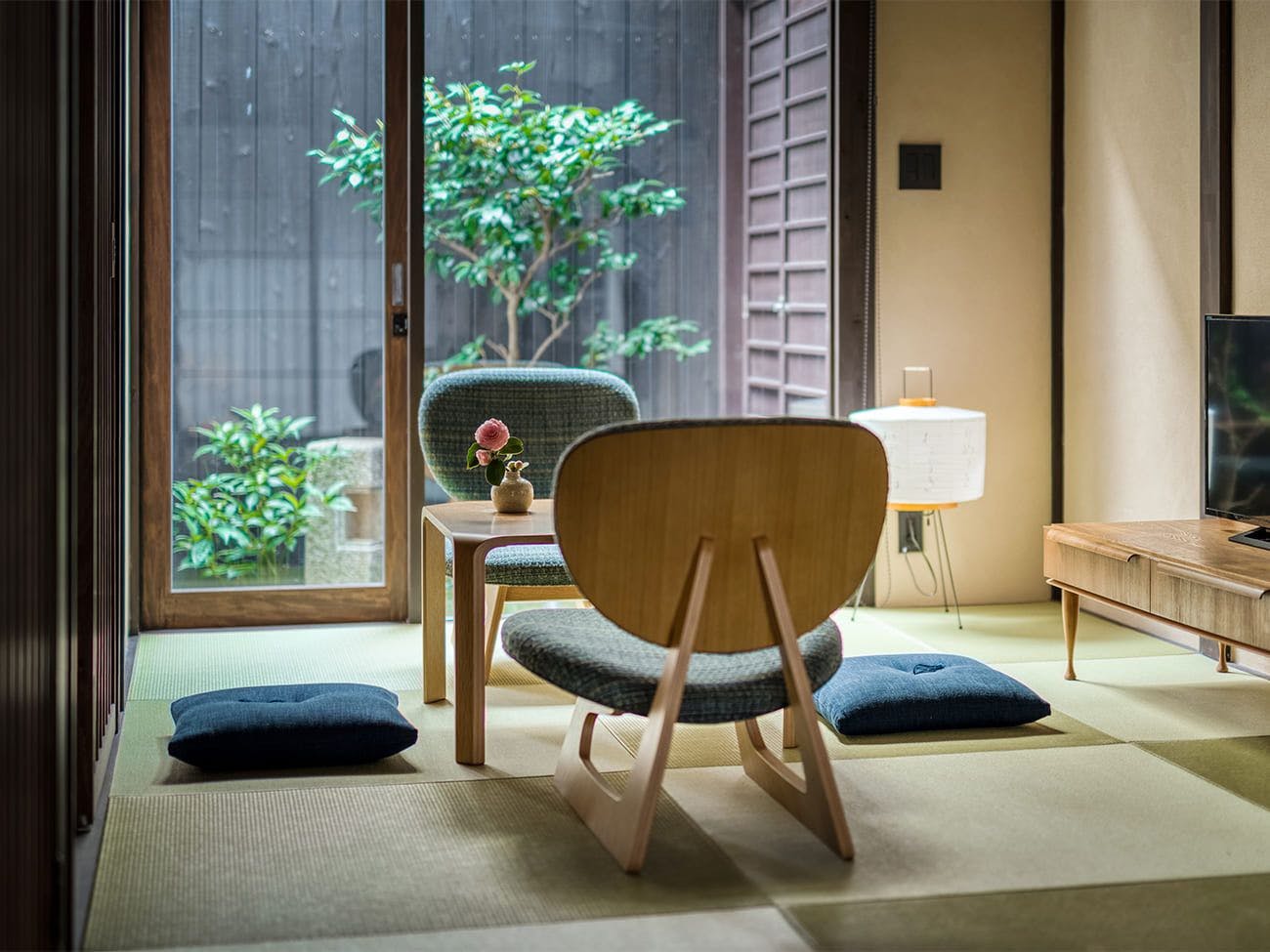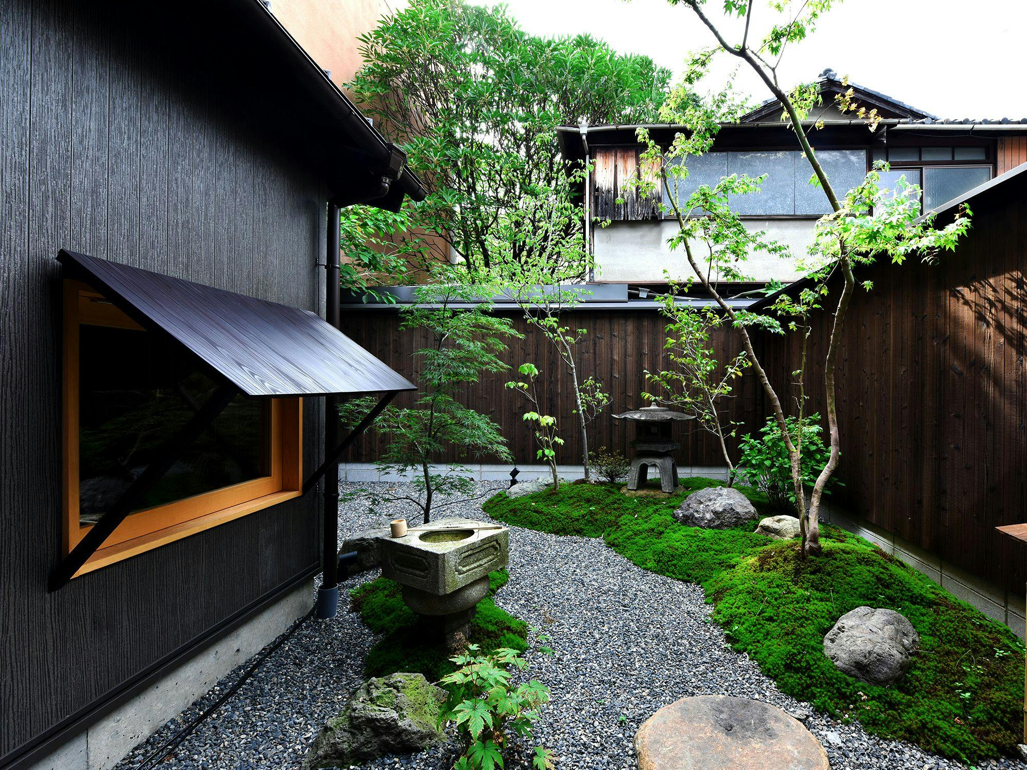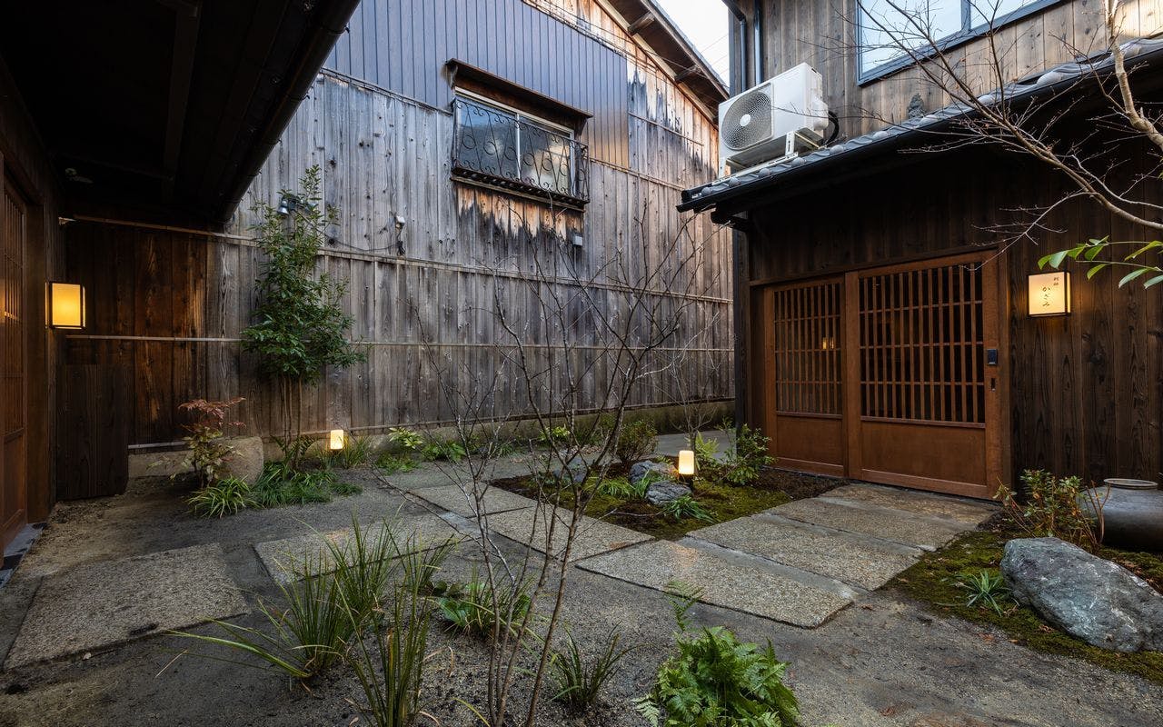 祇園の中心地に佇む 大人の隠れ宿庭を眺めて過ごせるラウンジの平屋と小竹揺らめく中庭を挟んで建つ2階建ての町家二棟を行き来しながら流れる贅沢な時間