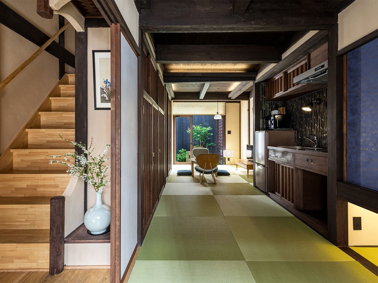 令和4年3月開業!祇園のお茶屋をリノベーションした一棟貸の宿。特徴的な収納階段や古い柱、建具など古い建物を生かしながらも現代生活に合った快適な居住空間。伝統とモダンを兼ね備えた独特の雰囲気が新鮮です