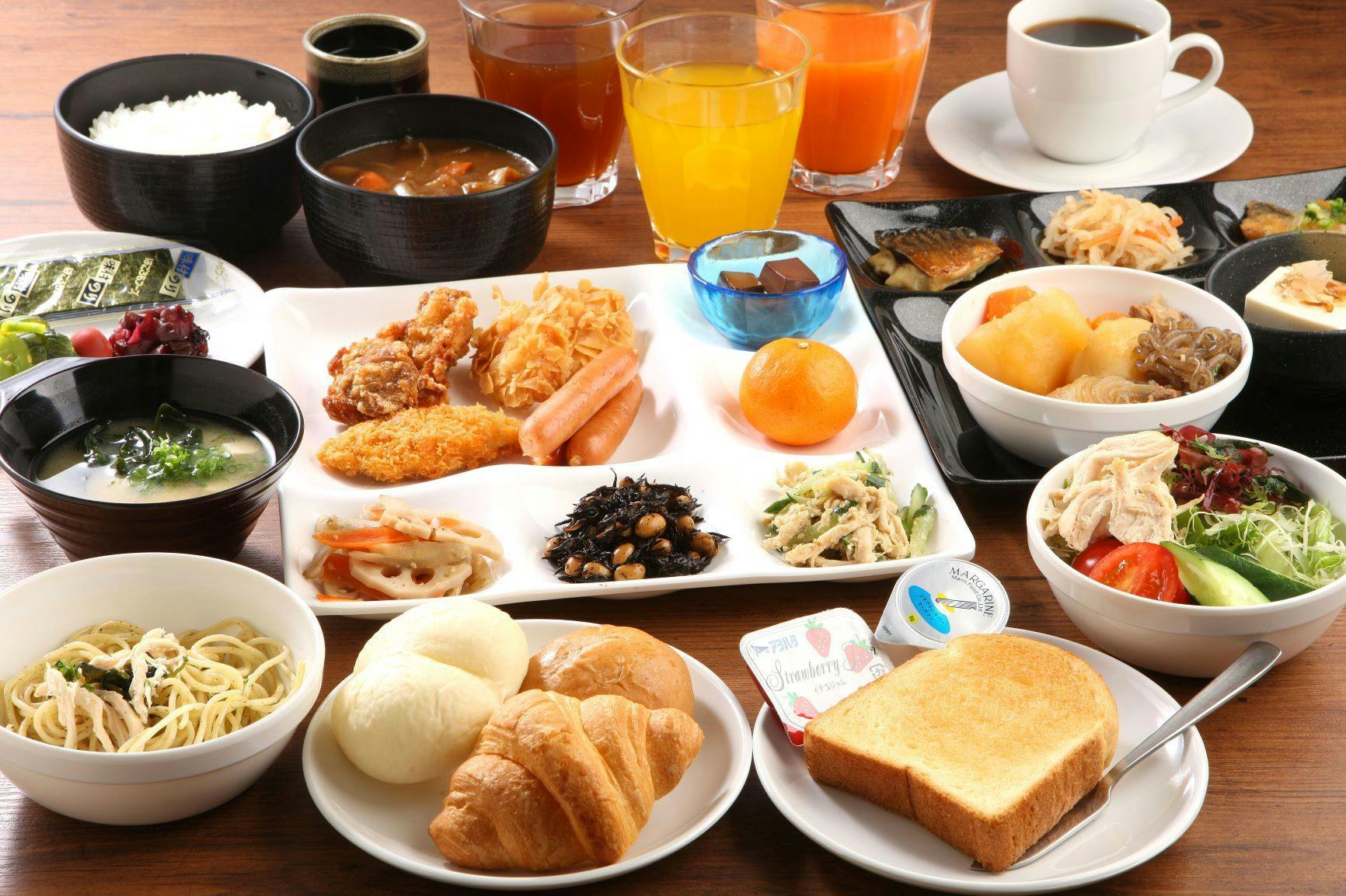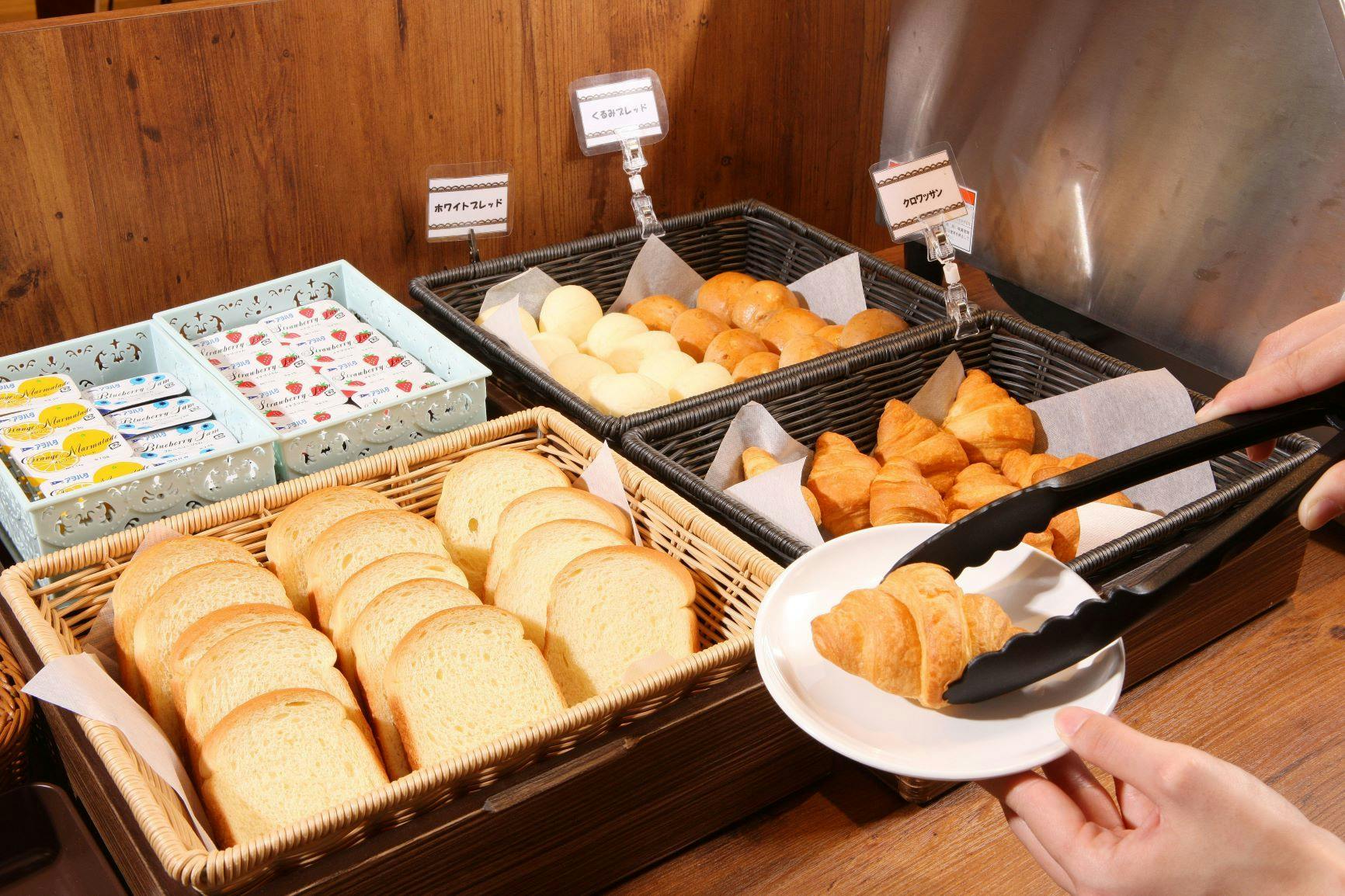 お泊りの際に寛いでいただけるよう、全てお部屋が16平米以上の広々空間で、新築ならではのセキュリティと新型感染症対策も万全です!朝食はボリュームたっぷりのメニューを常時約30品目提供いたします。