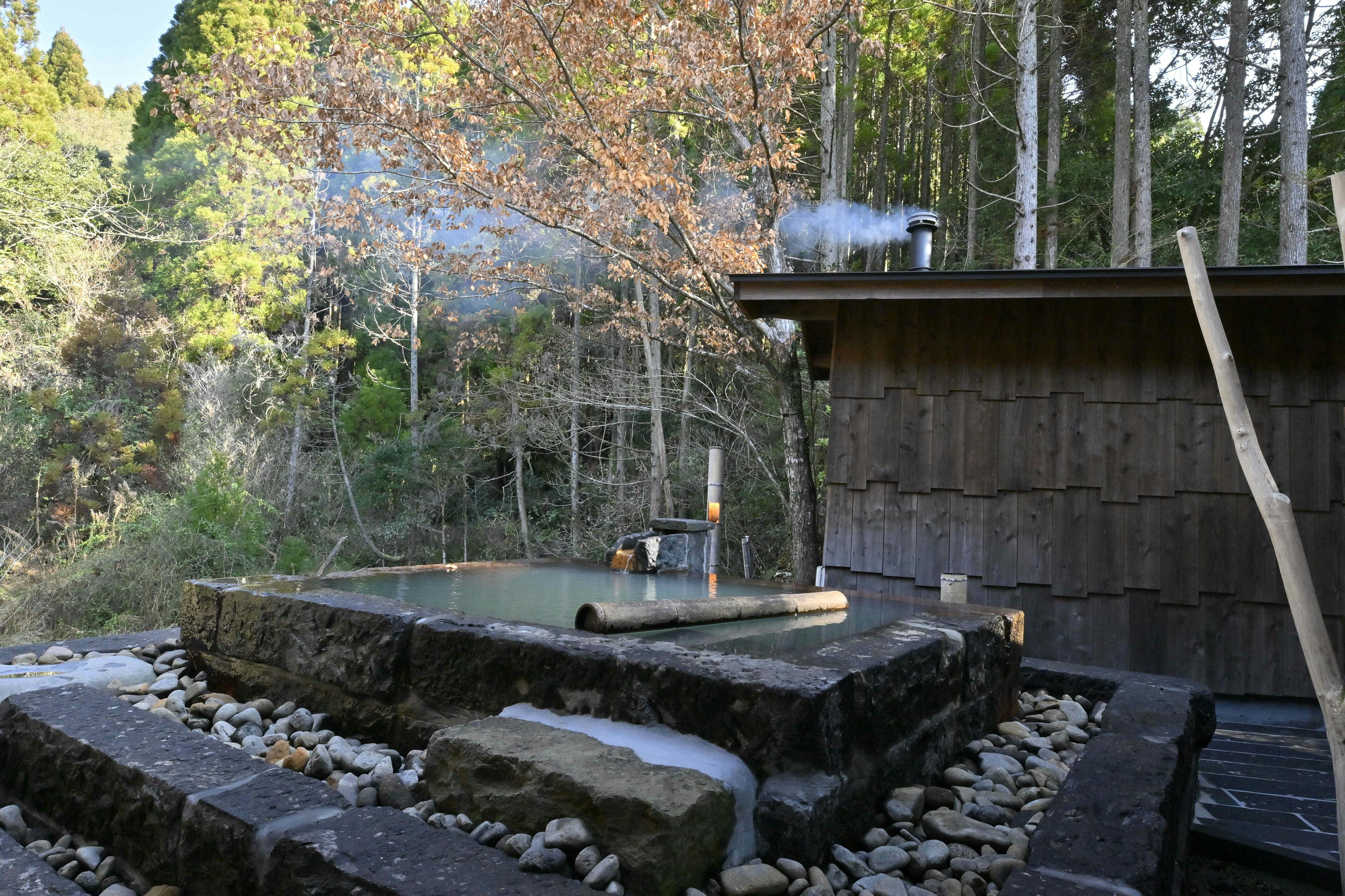 自然に囲まれた全室一軒家離れ、全客室に内湯と露天風呂があり全室源泉かけ流しの一日5組の小さなお宿です。令和5年3月にプライベートを楽しんでいただくため2時間貸切入浴施設無創庵をオープンさせました。