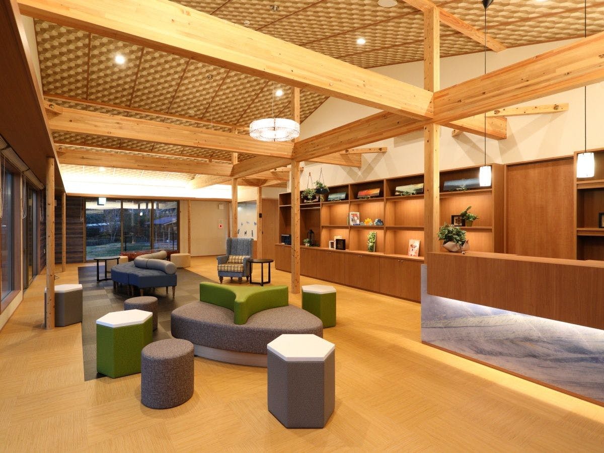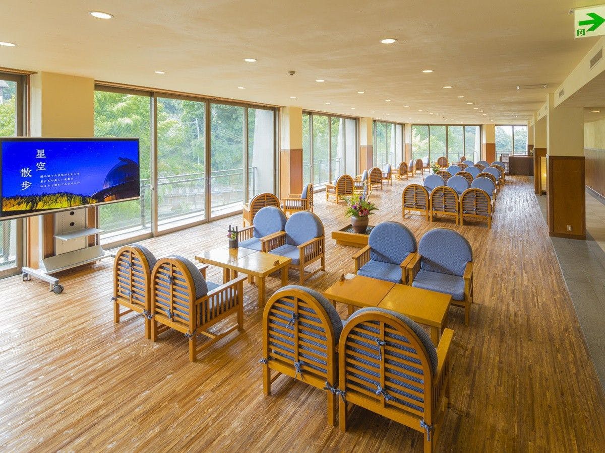 最上階まで吹き抜けのアトリウムからは陽光が差し込み、自慢の温泉施設は嬉野の街を一望できる最上階に。