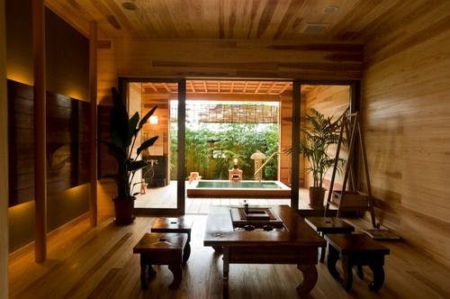 【ミシュランガイド2018熊本大分】「最上級の快適」受賞 全13室すべてが離れのメゾネット、リビングから繋がる開放感溢れる内湯とお庭の露天風呂には、美人湯と謳われる源泉をそのままに掛け流しています。