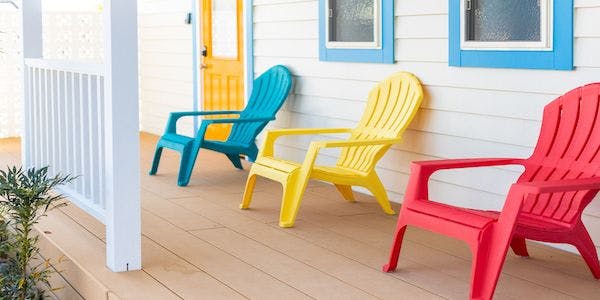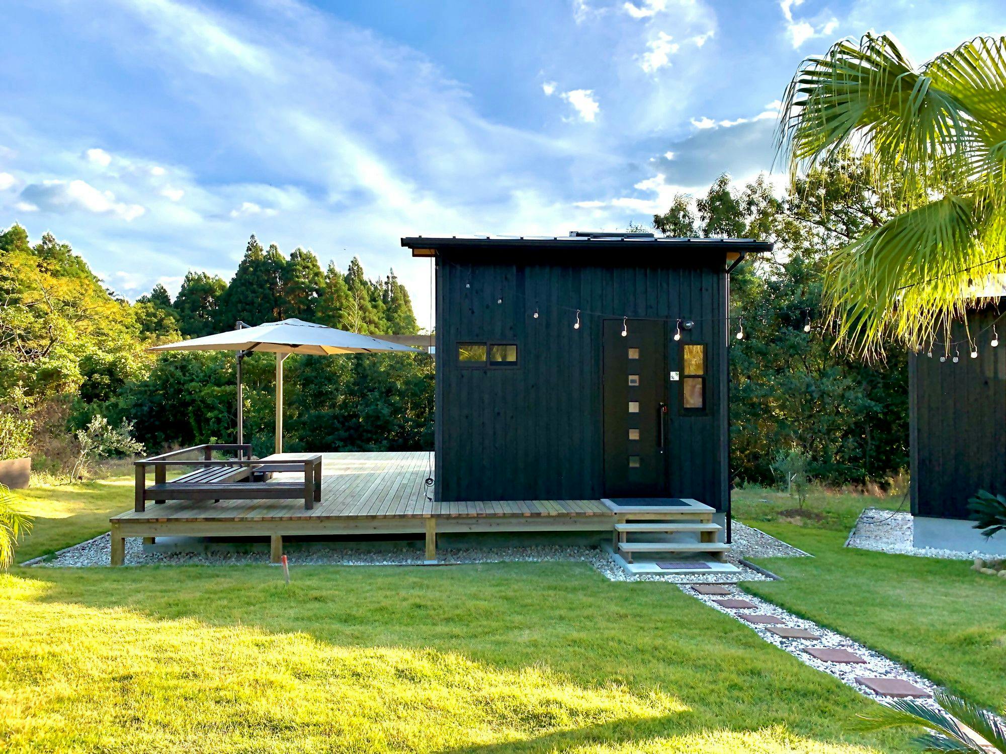 小さなコテージに大きなウッドデッキがあるLe Lodge美々津-EAST & WEST Deluxe日向市美々津にあるお洒落なタイニーハウスです。
