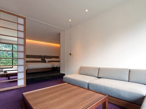 15万坪の敷地を有する御船山楽園の中にある宿。コンセプトは「庭屋一如」。庭や建物、四季、自然、周辺の環境が一体となった癒しの空間をつくり、皆さまと分かち合いたいという願いが込められています。
