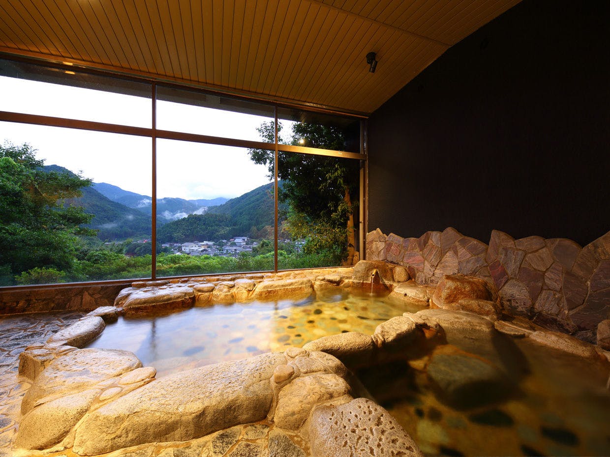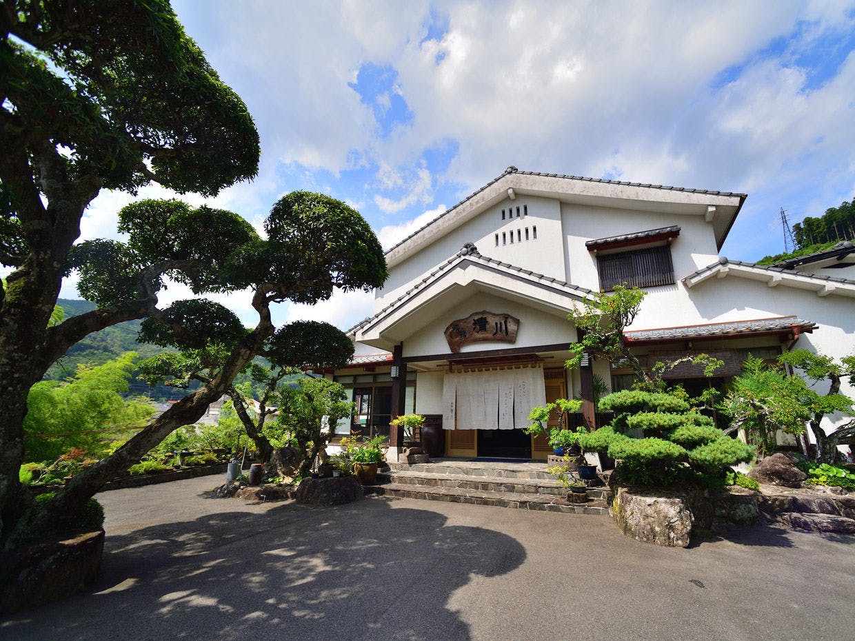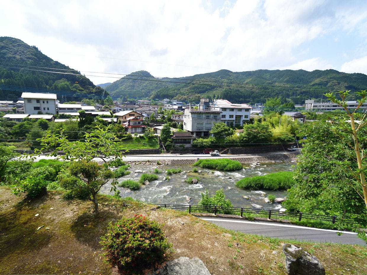 古湯温泉街を一望する高台に佇む眺望自慢の温泉宿。38度のぬる湯は肌触りが柔らかくph9.5と泉質も抜群です。山菜、川魚を中心とした会席料理は優しい味を愉しめると評判。静かにのんびり過ごす旅に最適です。