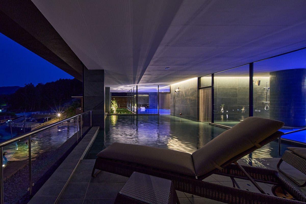 最上階まで吹き抜けのアトリウムからは陽光が差し込み、自慢の温泉施設は嬉野の街を一望できる最上階に。