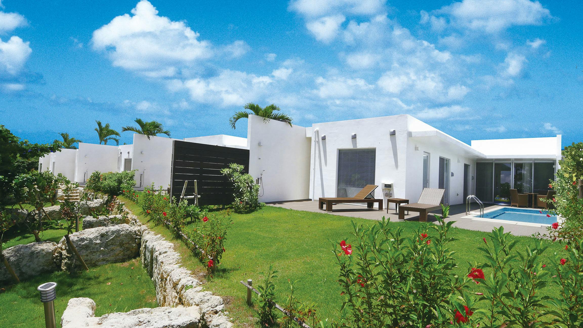 宮古島の南岸、ビーチフロントに建つ別荘スタイルのヴィラです。 全12棟のヴィラにはすべてプライベート感あふれる温水プールを設置。 キッチンや家具・家電を完備しており、ロングステイにもご利用できます