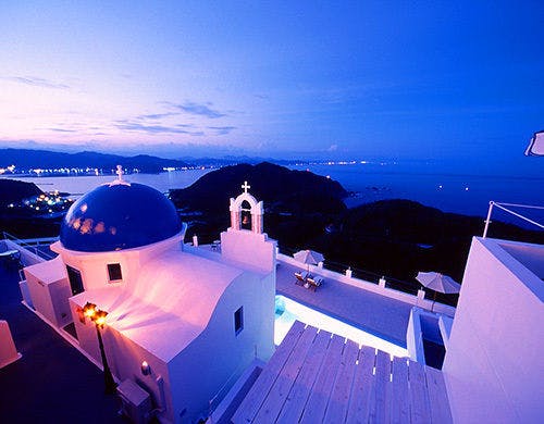 ギリシャサントリーニ島をそのままイメージしたリゾートホテル。エーゲ海さながらのロケーションは抜群。お食事はイタリアン料理を楽しめます