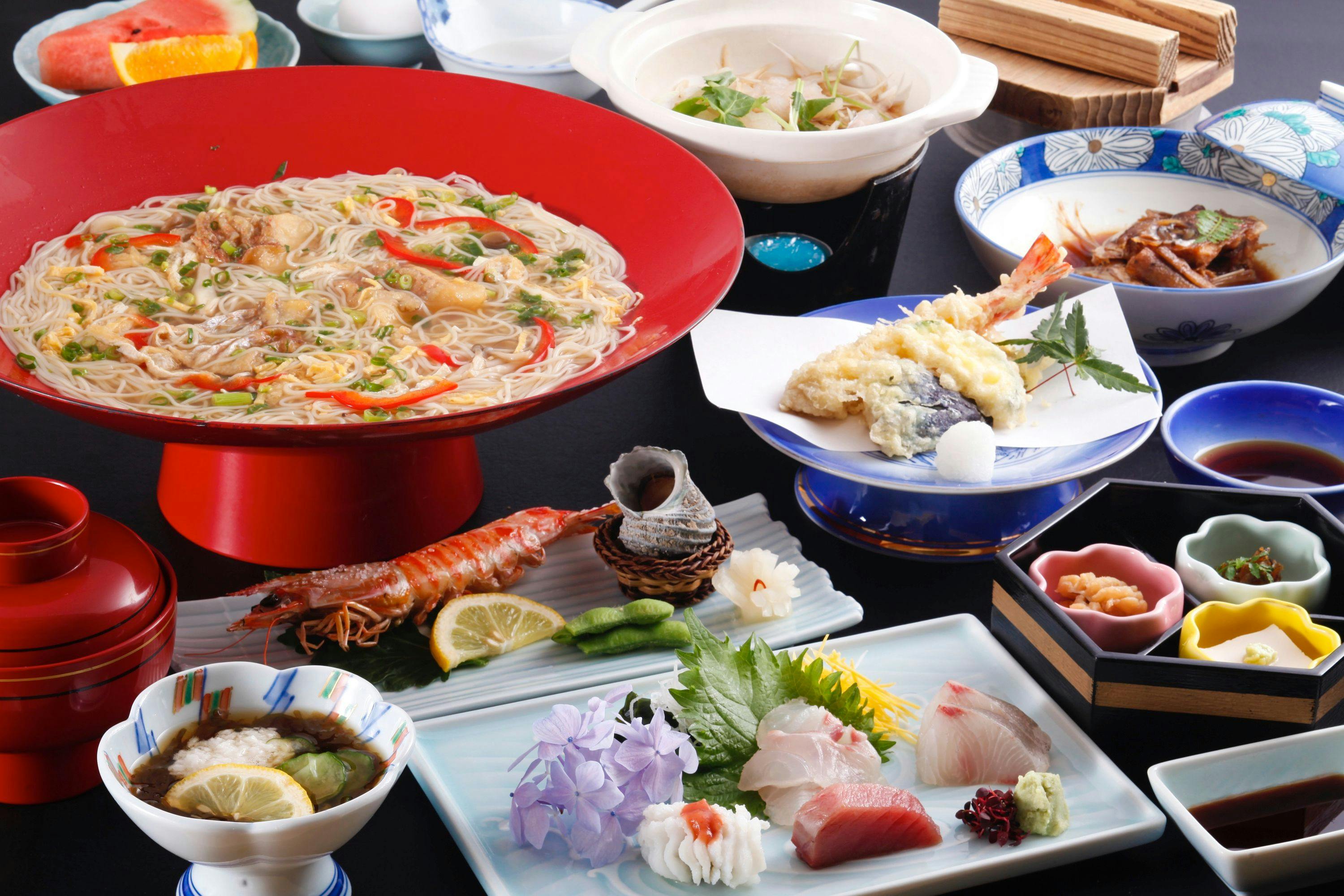 創業文久3年、淡路島最古の老舗旅館。新鮮な食材を使った料理は個室でゆったり頂けます。名物は鯛を丸ごと1匹大皿に盛った「鯛めん」。豪快な見た目ながらさっぱりとした味わいで、ボリューム満点の絶品です。