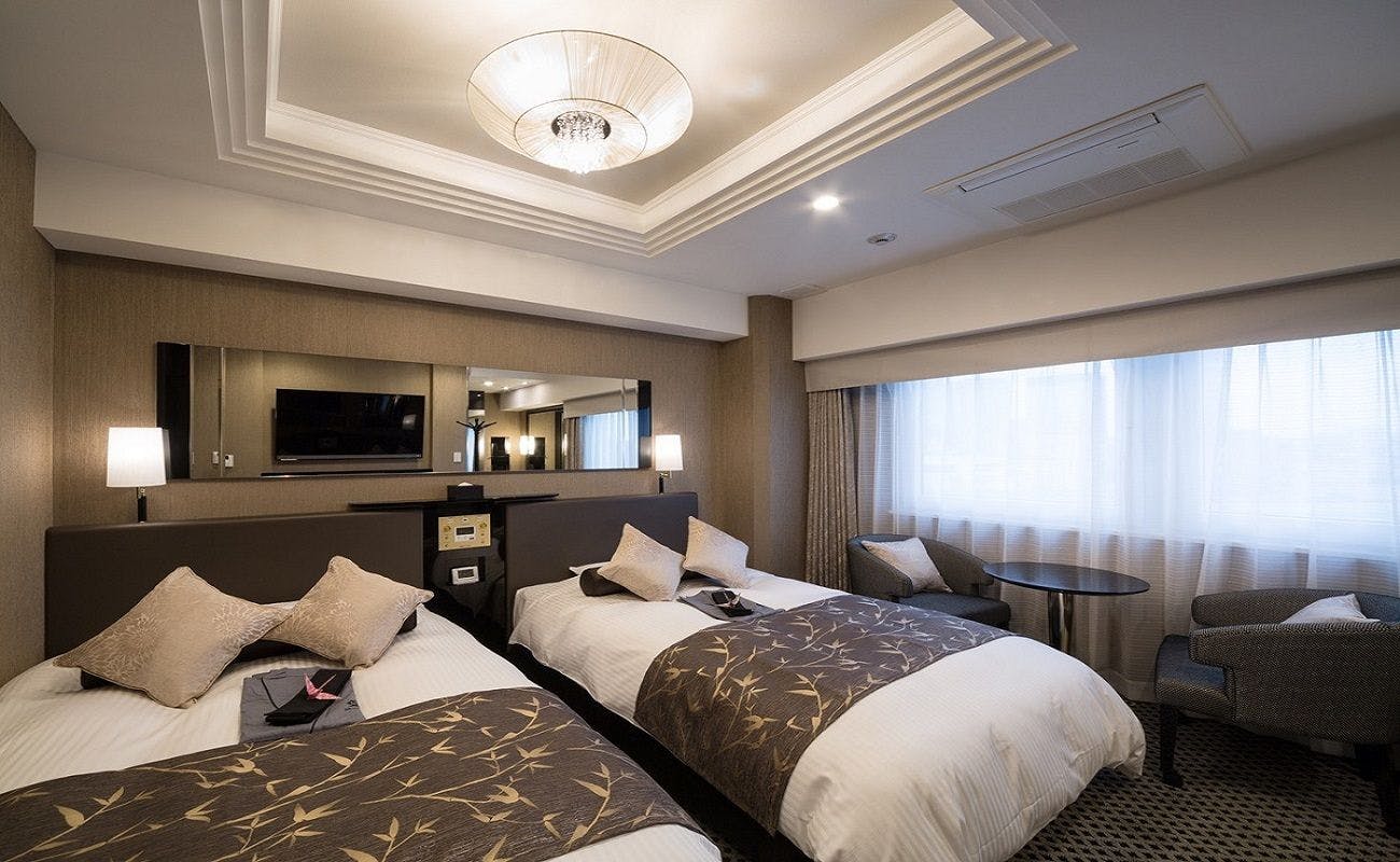 岡山市繁華街へも徒歩近くホテル前には公園や川が流れる閑静な立地。サータのベッド、靴を脱いで寛ぐ仕様も好評。加湿空気清浄機・無料Wi-Fi・YouTubeも視聴できる43型4K液晶テレビ・個別空調完備。