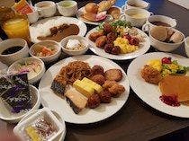 京文化を感じさせるリビングロビーや和モダンの落ち着いた雰囲気のお部屋でお寛ぎ頂けます。朝食はメイン4種類+サラダやフルーツは好きなだけお取りいただくセミブッフェスタイルでご提供致致します。
