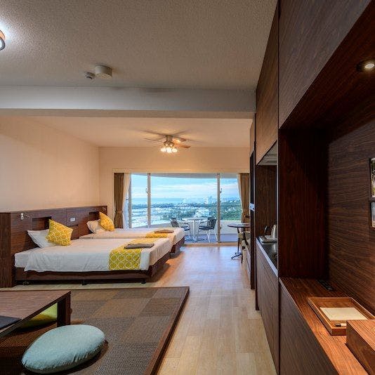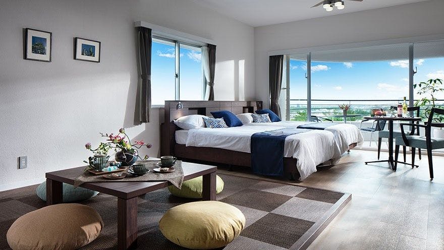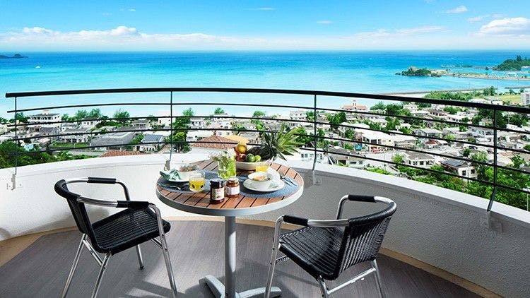 沖縄本島の中心恩納村の丘の上に位置し西海岸の青い海が一望できます。「住まうように泊まる」ことができるコンドミニアム形式のホテルで沖縄の「海・空・風・光」を感じてお過ごしください。