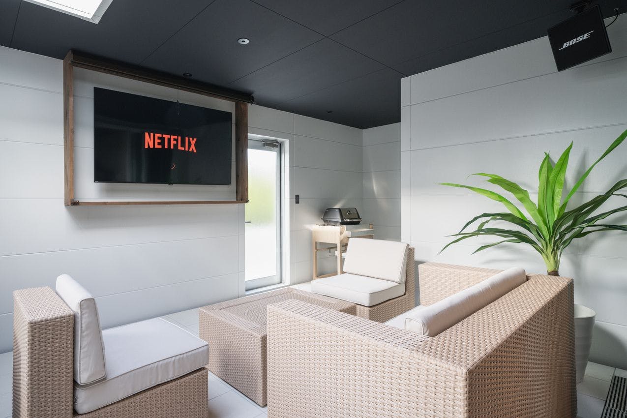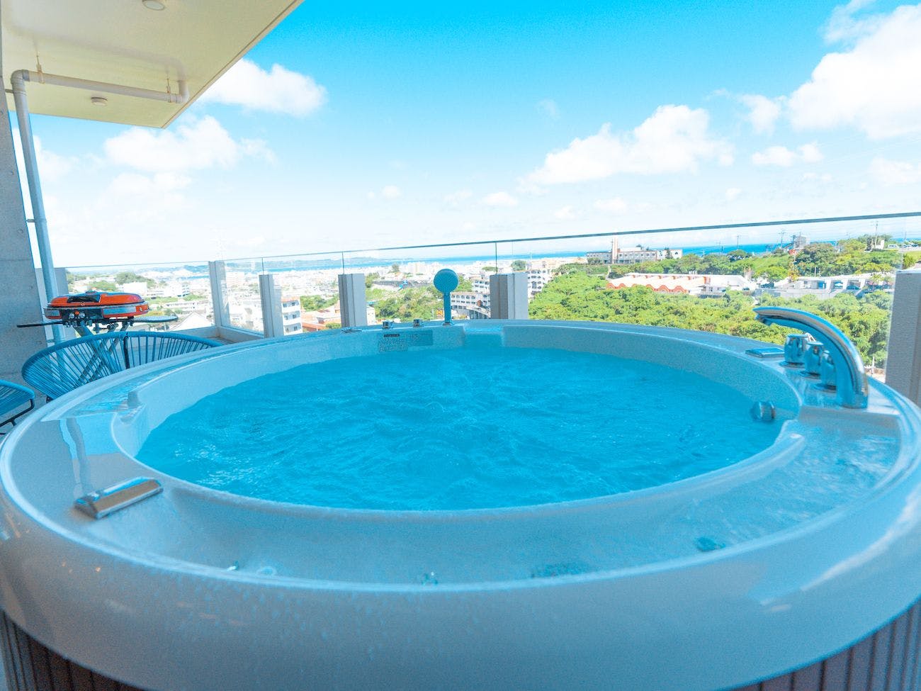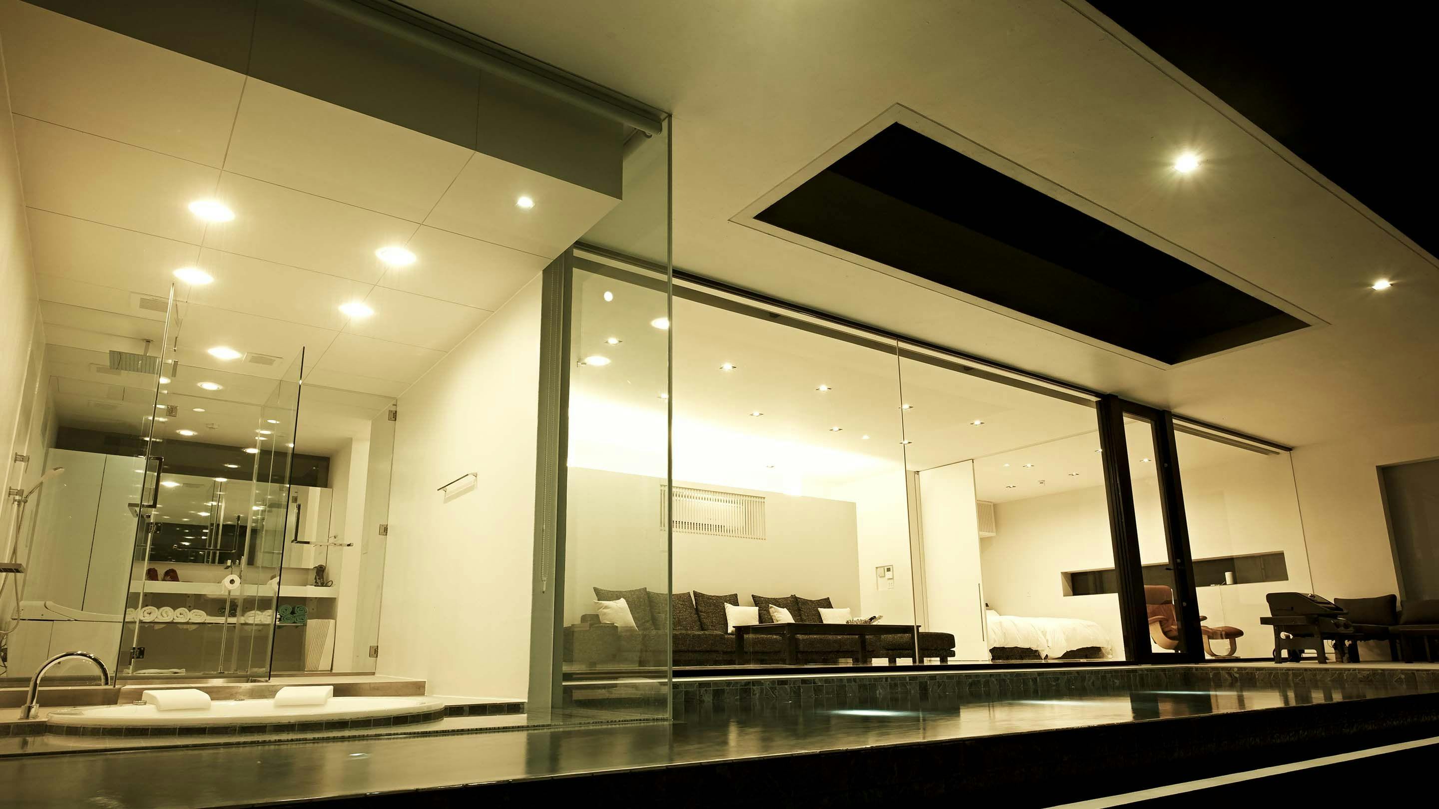 源泉掛け流しの天然温泉の内風呂と、バルコニー露天風呂付きです。シアタールーム(Amazon Fire TVつき)やマッサージチェアーで日常の疲れをゆったり癒しながらお楽しみいただけます。