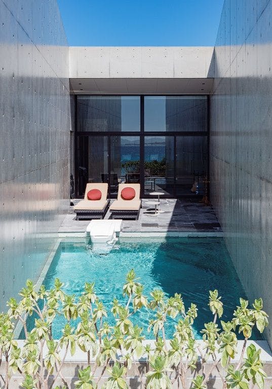 空に向かって立ち上がる高さ5.6mの壁面。その中へ一歩入ると、静かで落ち着いた空間はまるで異世界。一棟貸しのプライベート空間で、特別な思い出をお作りください。