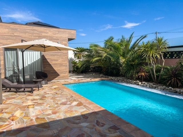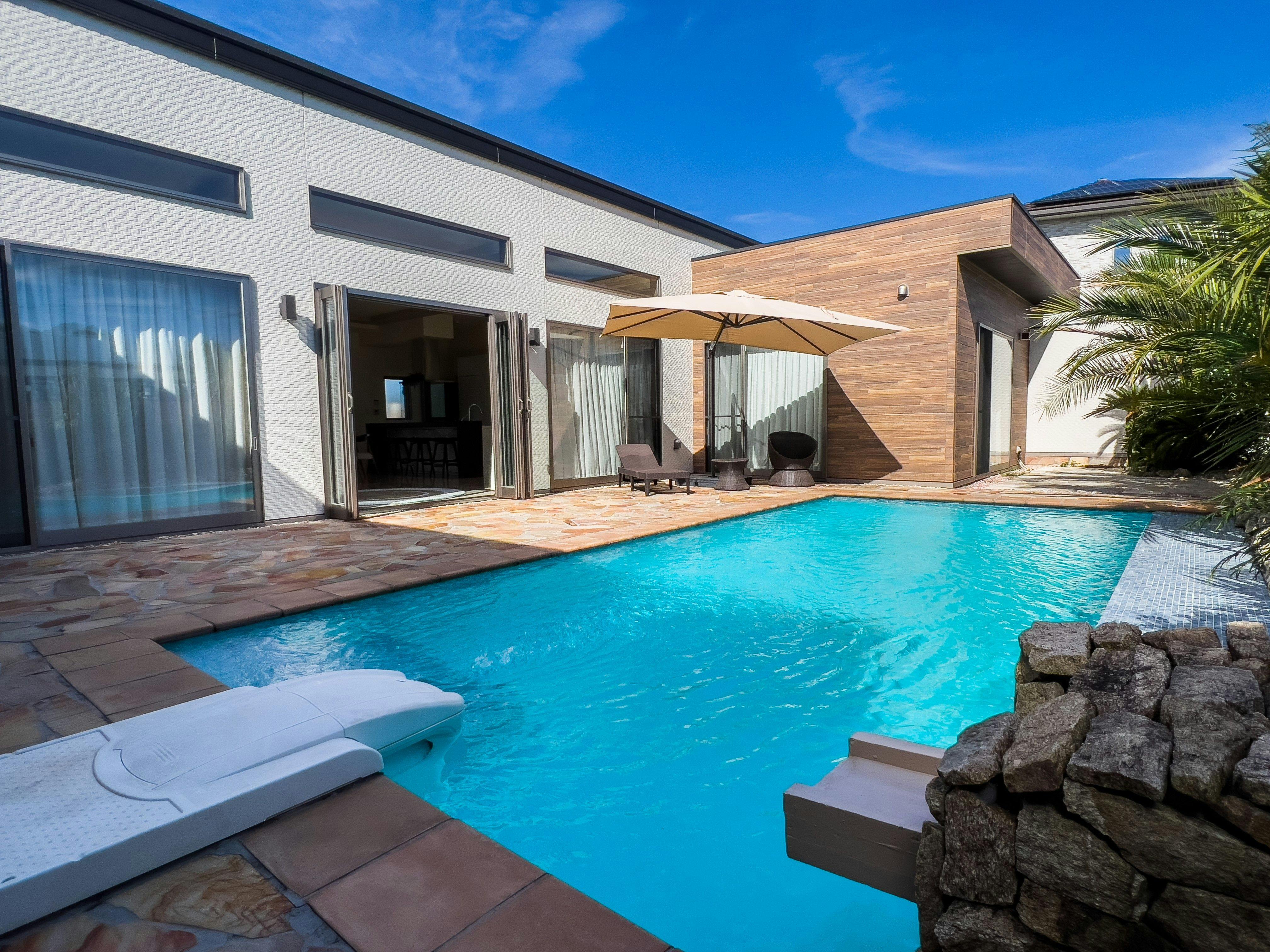 千葉県・長生村の田園風景に南国風の佇まい。プール付きの大人向けプライベートリゾートで、優雅な休日をご堪能下さい。海水浴やゴルフなど、旅の拠点としてもご利用いただけます。