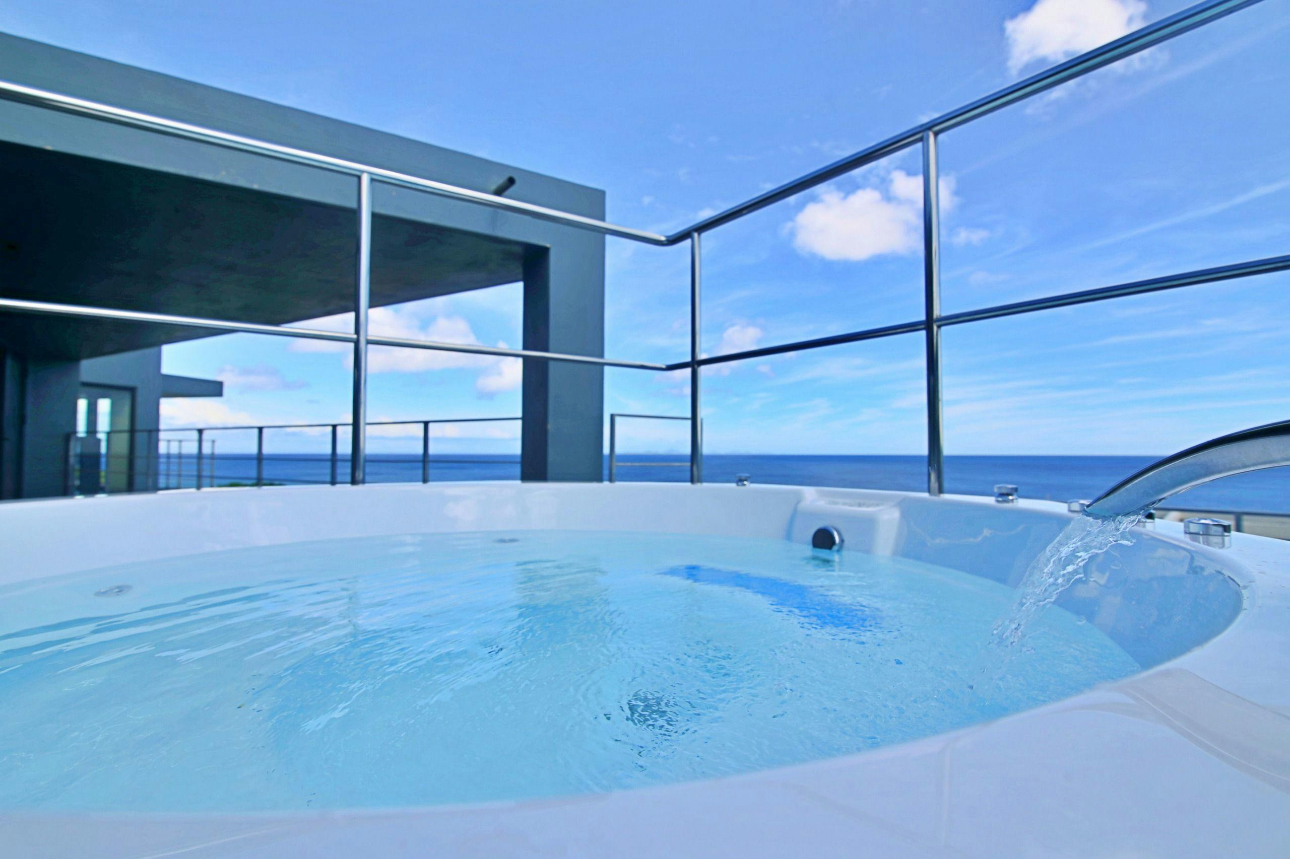 オーシャンフロントの一棟貸切のプライベートヴィラ!2F海側全てガラス張りです。日の暮れる海を眺めながら、心の赴くままに、好きな時に好きなだけ浸かって下さい。